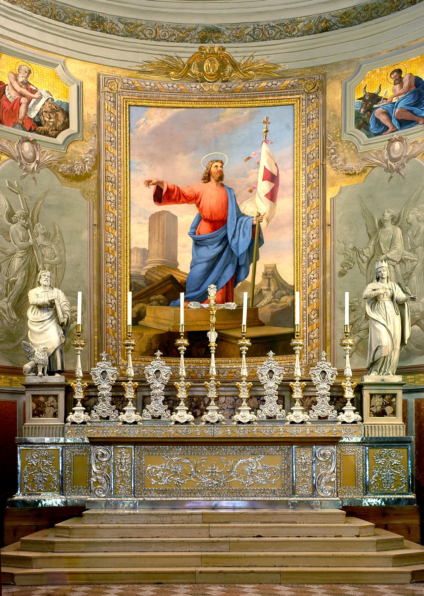 L’altare maggiore, in stile neoclassico, eseguito dagli scultori Giuseppe Turchetti e Fabio Candoni, risale al 1854. Il manufatto in marmo e diaspro siciliano fu arretrato di qualche metro verso l’interno dell’abside, sostituendo l’altare originale ligneo, ormai deteriorato, fatto costruire nel 1645.