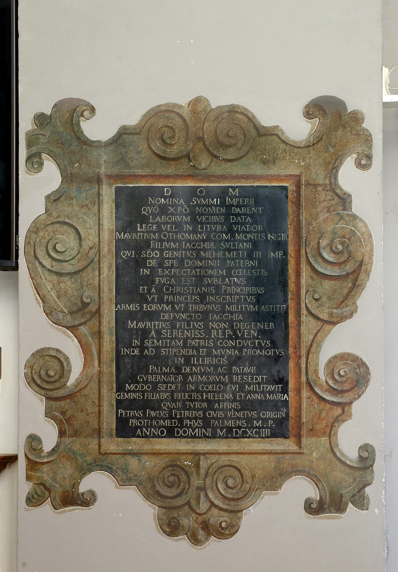 L’iscrizione funeraria, posta sulla soglia della cappella, di fronte alla lapide dedicata alle sorelle Ciceri, è chiara testimonianza della presenza eterogena della popolazione civile e militare che abitava in fortezza. Proviene dall’Oratorio di San Filippo Neri da dove venne asportata nel 1840 e qui collocata. La lapide ricorda la vita del Governatore alle Armi, (importante carica di potere in fortezza) Principe Maurizio Ottomano morto il 17 novembre 1693. Il padre di Ottomano era il sultano Jacchia, a sua volta figlio del sultano Maometto III. La madre di Jacchia, Elena Commeno era cristiana, mai convertitasi alla fede islamica. Maurizio giunse a Palma nel 1682, dopo aver prestato servizio, come Governatore, in Dalmazia e a Padova, per conto della Serenissima. Nell’iscrizione si ricordano le due figlie gemelle Elena ed Anna Maria ed il loro tutore Pietro Paolo Petreio, protomedico fisico, cognato del Principe Maurizio.