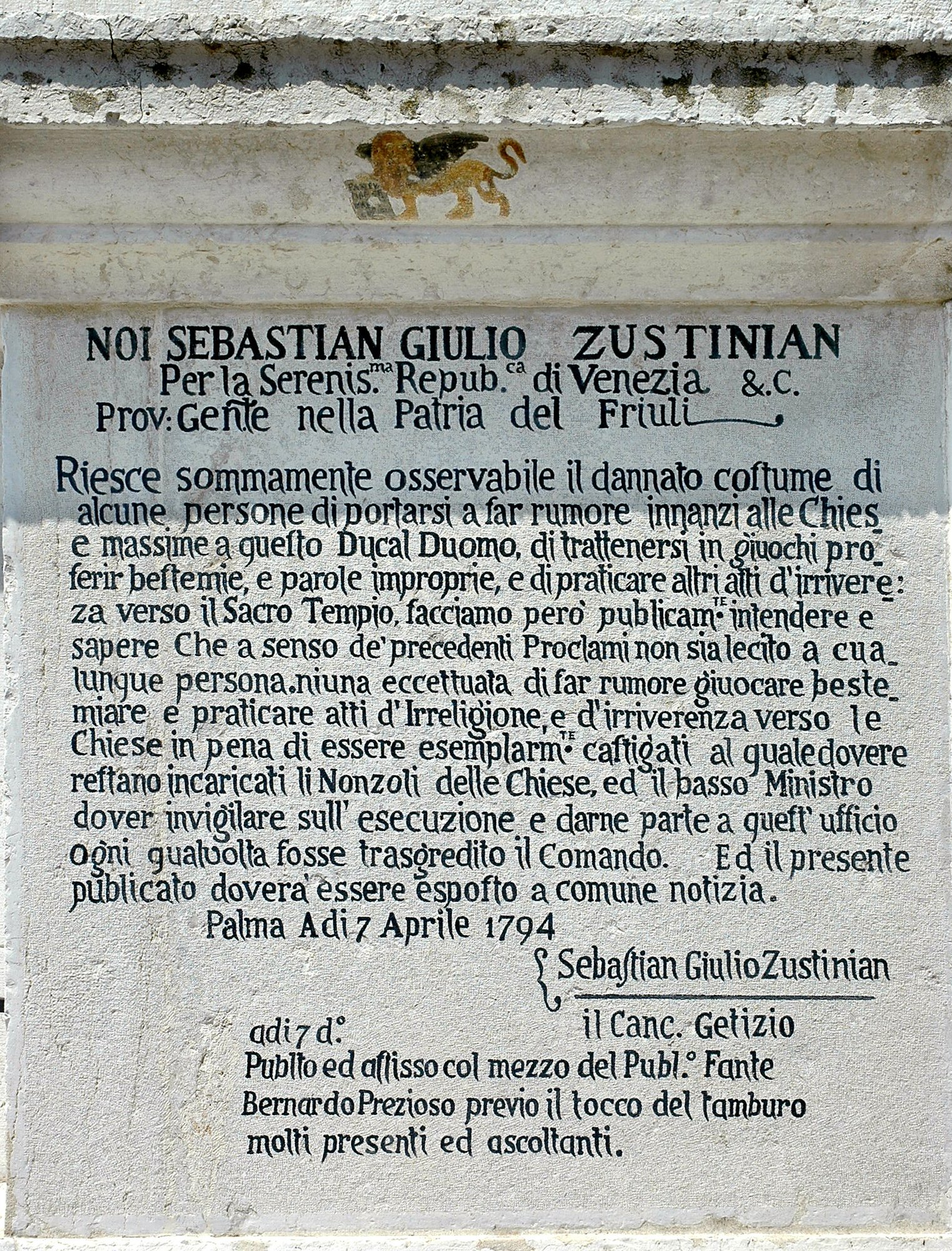 Prima di visitare l’interno della chiesa, particolare attenzione merita un piccolo affresco di periodo veneziano raffigurante un leone marciano, collocato sul pilastro esterno verso Contrada Donato, probabilmente sfuggito alla furia iconoclasta francese. Interessante il proclama sotto riportato che ordina di non praticare azioni irriverenti contro la religione e la chiesa.