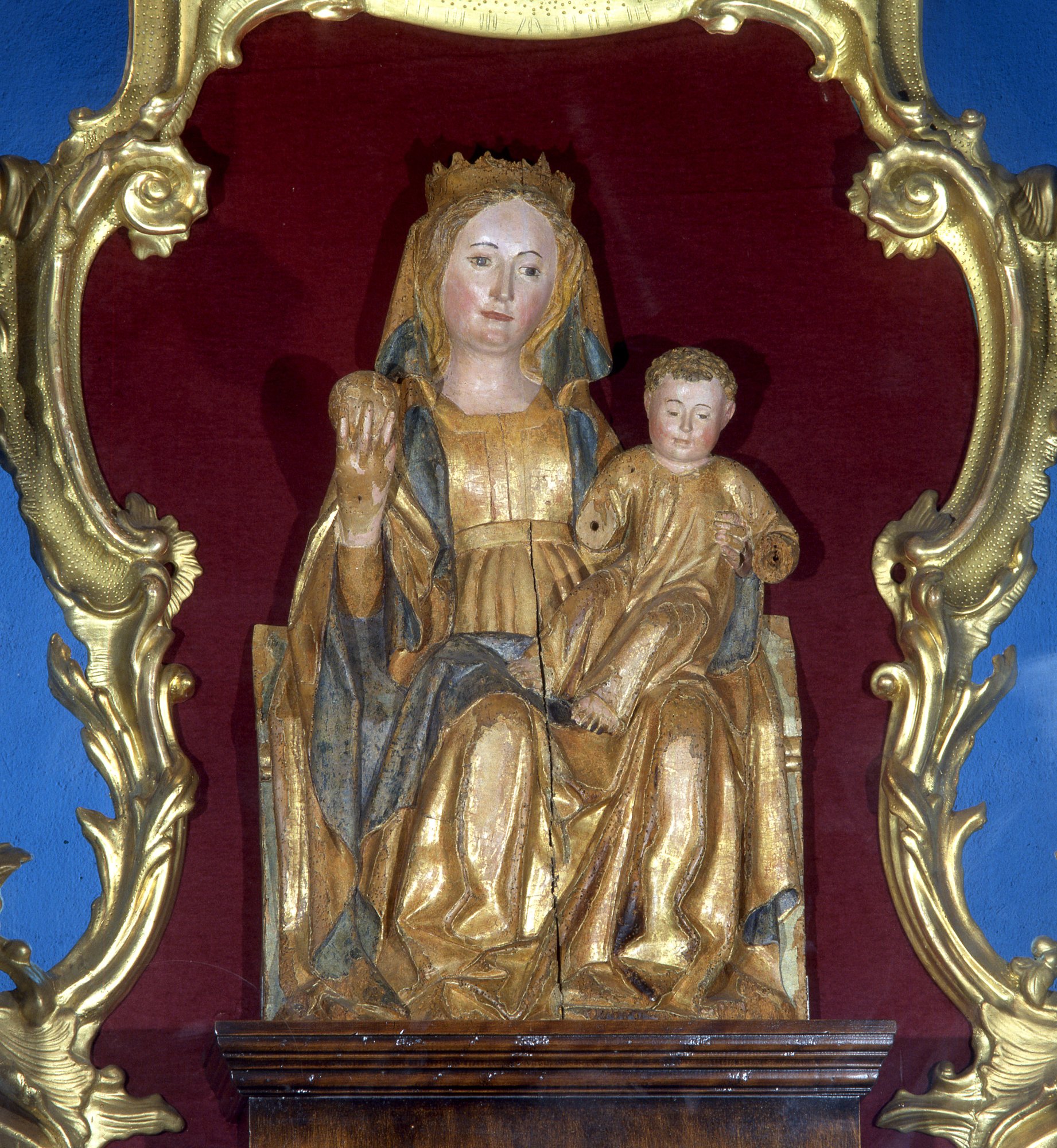 La scultura lignea collocata sull’altare della cappella e raffigurante Madonna in trono con Bambino è opera del Cinquecento, attribuita a Martino Mioni da Tolmezzo, fratello di Domenico da Tolmezzo (1448-1507). Il manufatto proviene quasi certamente da una delle chiese dei villaggi circostanti, Ronchis, San Lorenzo e Palmada, distrutti dai Francesi per ampliare le fortificazioni di Palma.
