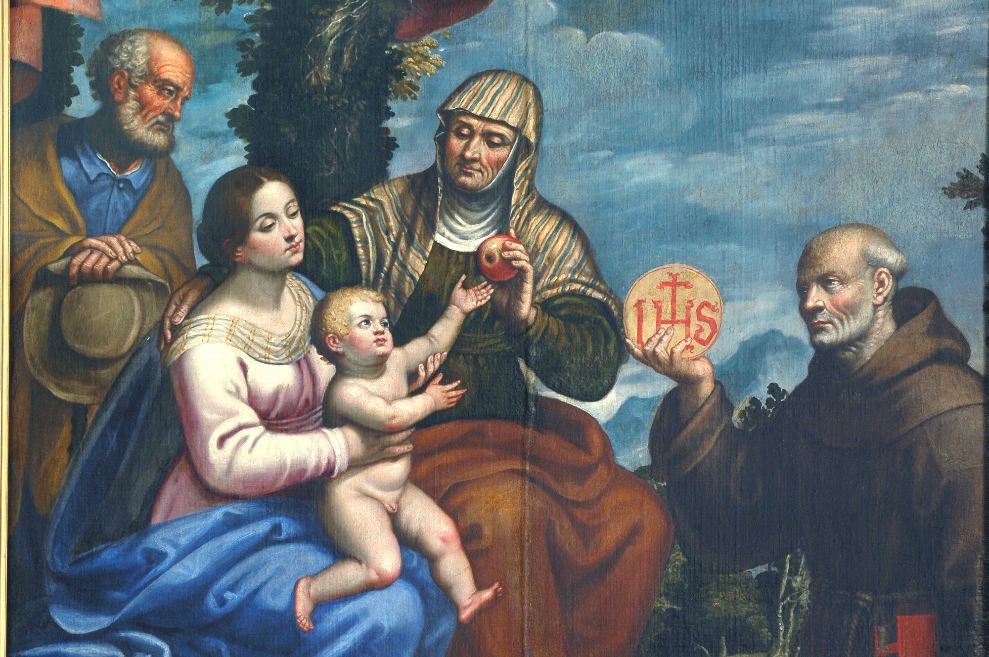 Il dipinto di Eugenio Pini, del 1645, fu eseguito per volontà di Anna e Bernardino Stua. Sul bordo sinistro della pala si legge “Anna Stua fece far per la sua devozione”. Evidenti i motivi che hanno dettato la scelta dei santi da raffigurare. La scena pittorica, infatti, illustra il Bambino, che sulle braccia di Maria, sembra svincolarsi per prendere la mela che Sant’Anna gli porge. Più in basso a destra san Bernardino da Siena, propagatore della devozione del Santissimo Nome di Gesù, che regge il disco con il monogramma IHS, diventato il suo principale attributo iconografico. Il vecchio Giuseppe, alle spalle di Maria, osserva composto la scena; in alto l’Eterno Padre e gli angeli che intrecciano un tronco di quercia con festoni. Va ricordato che sotto la tela veniva un tempo alloggiato un insolito reliquiario con forma di croce a raggiera ed esposto ai fedeli per mezzo di un apposito argano. L’opera venne eseguita dall’artigiano Silvio Piccinini nel 1895.