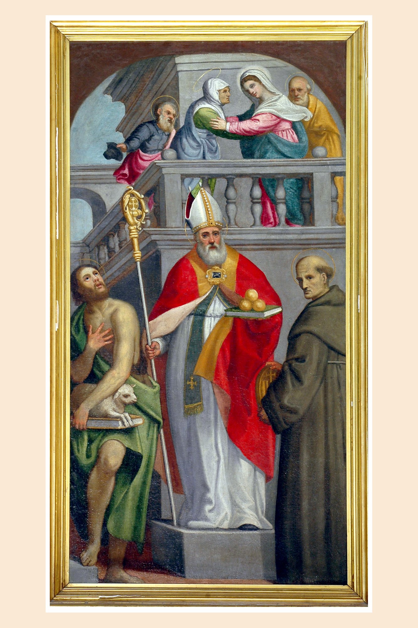 Al di sotto un quadro raffigurante la Visitazione e i santi Giovanni Battista, Nicola da Bari e Bernardino da Siena, già pala dell’altare di San Nicola del precedente edificio, eseguita nel primo decennio del Seicento, probabilmente da Secante Secanti, pittore udinese.