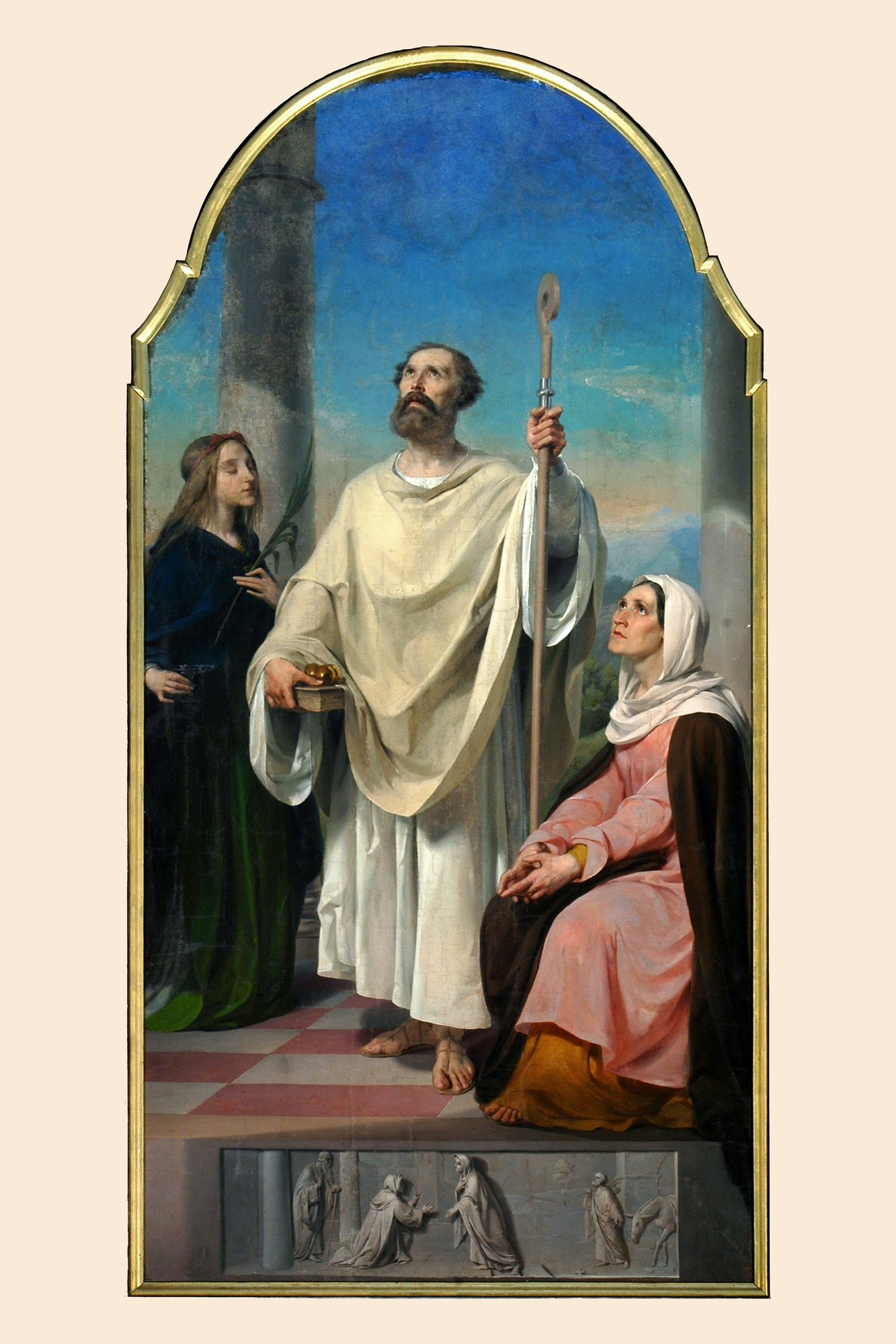 In quest’opera della maturità, come in altre di soggetto religioso, l’artista udinese (1811-1862), che raggiunse assai presto (nel 1836) uno straordinario successo internazionale con il dipinto Il Diluvio (ora nei Civici Musei di Udine), ma che in seguito non seppe tener dietro alle aspettative, adotta un’impaginazione scenografica e un luminismo di fondo che non riescono tuttavia a riscattare la staticità, il tono didascalico della composizione e la freddezza dell’insieme. La bontà della tecnica è tuttavia misurabile nel monocromo con la Visitazione, che in basso chiude la composizione.