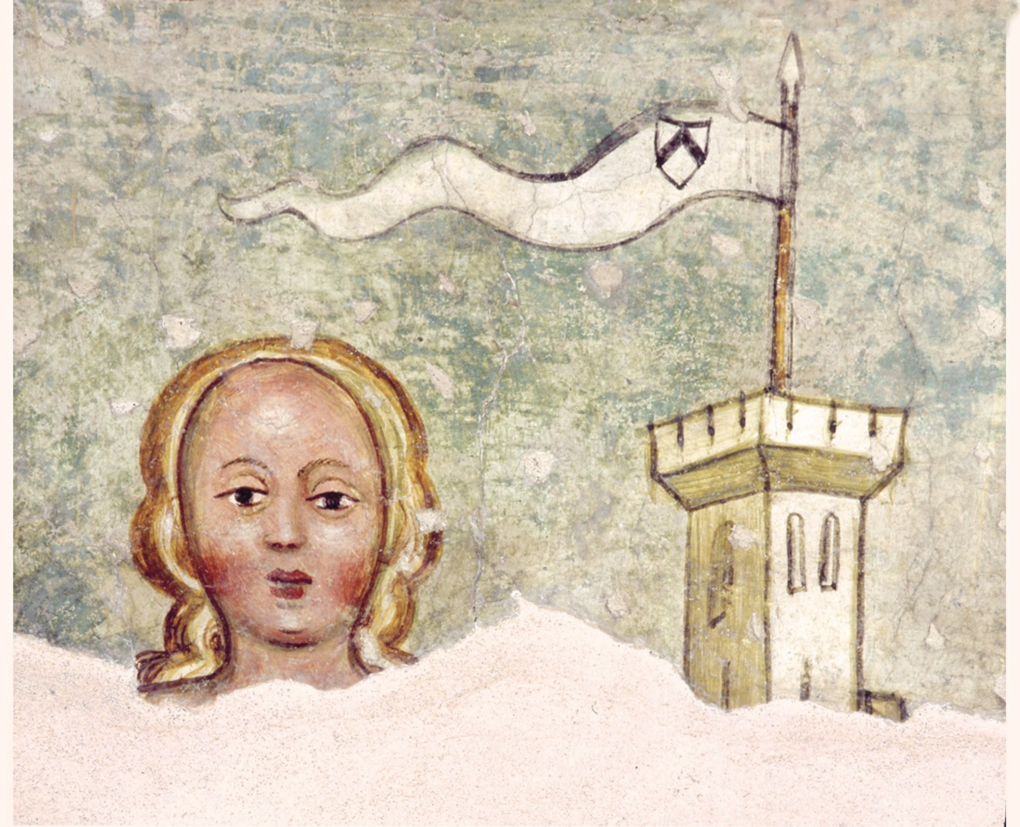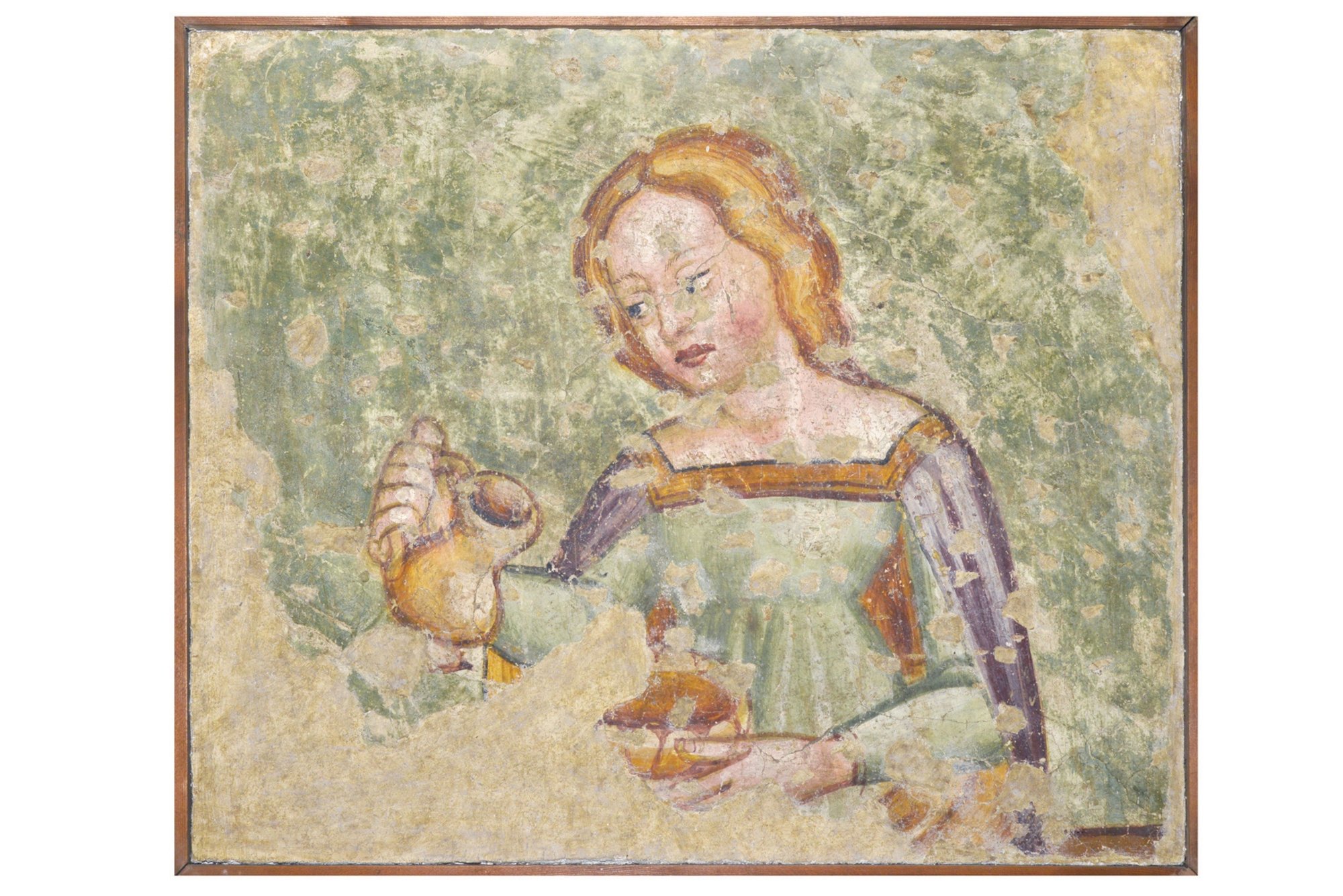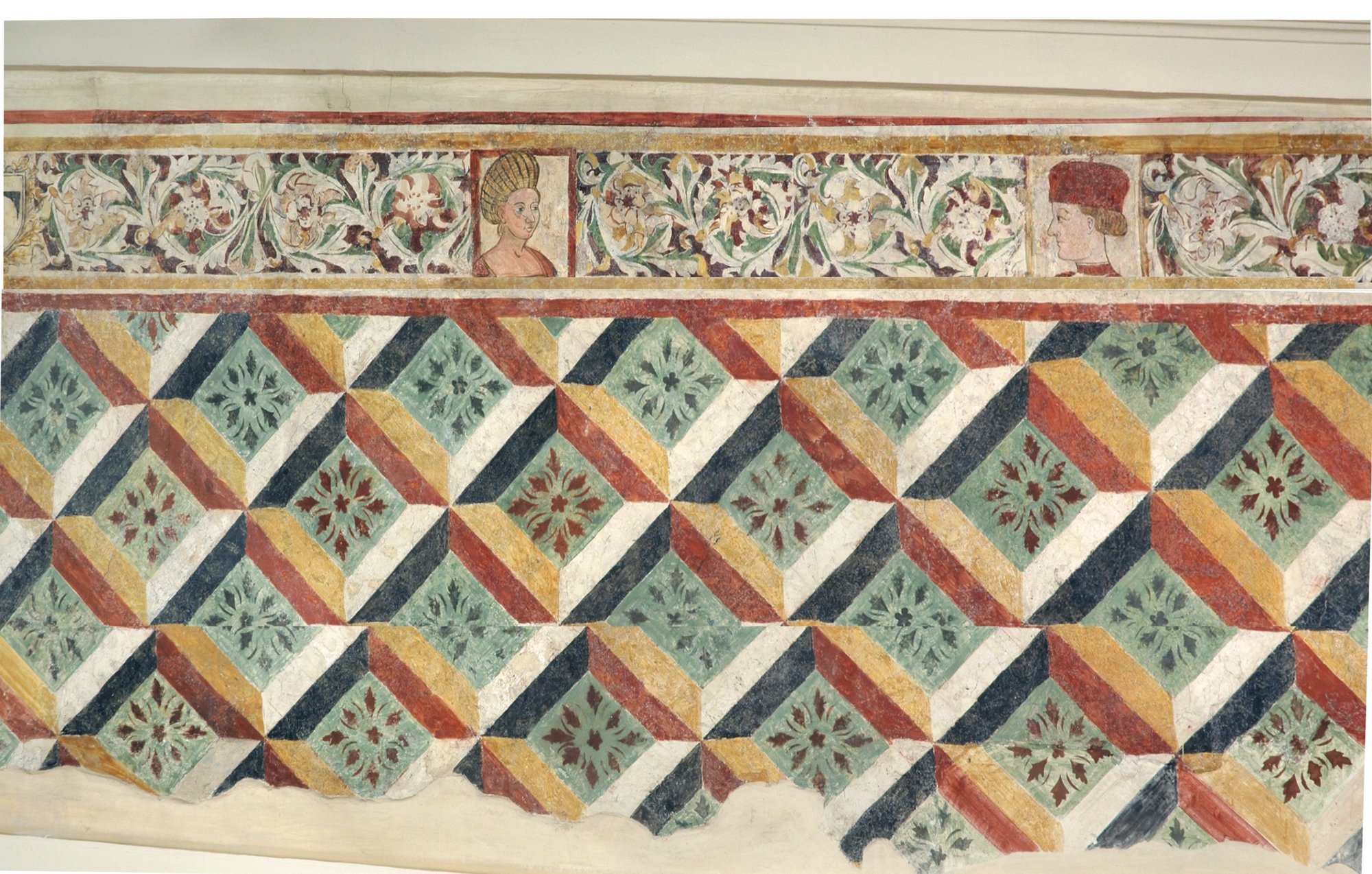 Di quella prima residenza sussistono delle tracce nell’atrio d’ingresso dell’attuale Palazzo, dove si possono ammirare di lacerti d’affresco del XV secolo, che raffigurano la Fede, la Speranza, la Carità, la Giustizia e la Fortezza: quest’ultima riveste notevole interesse, anche storico, poiché regge una torre sulla quale un vessillo mosso dal vento porta lo stemma di Udine.
