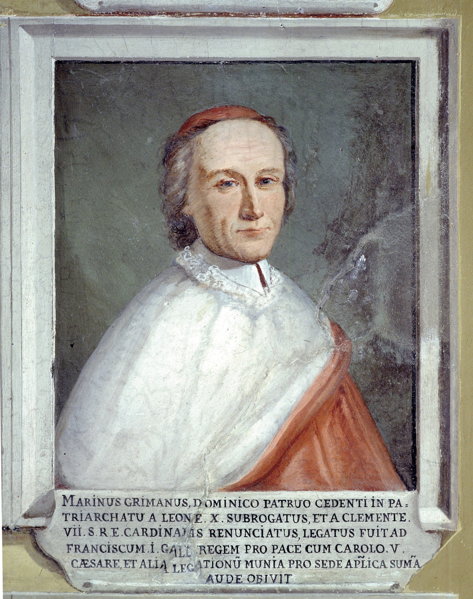 All’epoca del patriarca Marino Grimani va probabilmente ricondotta la decorazione a “grottesche”, che per antica tradizione è attribuita a Giovanni Nani da Udine, detto il Ricamatore (1487–1561), sulla volta dell’attuale Sala azzurra, unica stanza del piano nobile non interessata dalla riforma settecentesca del palazzo.