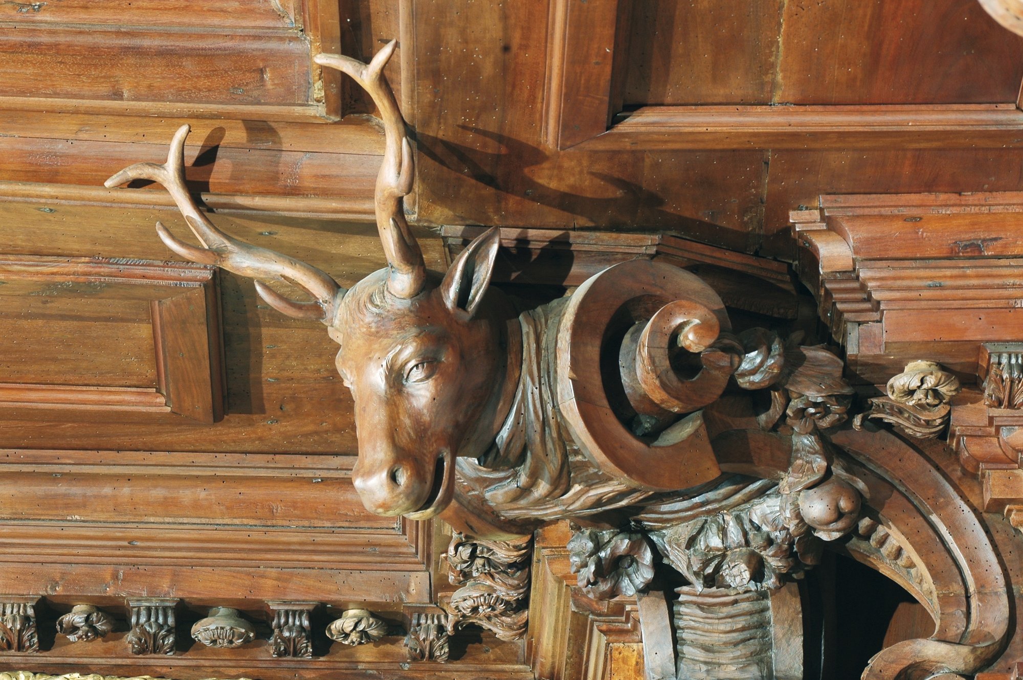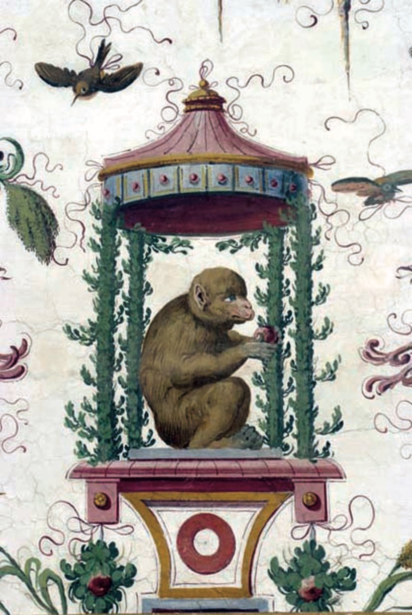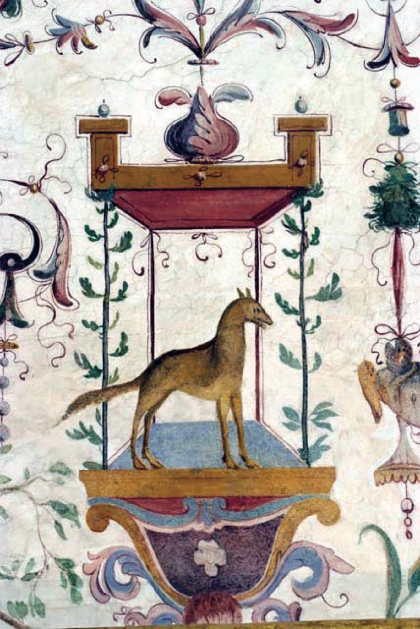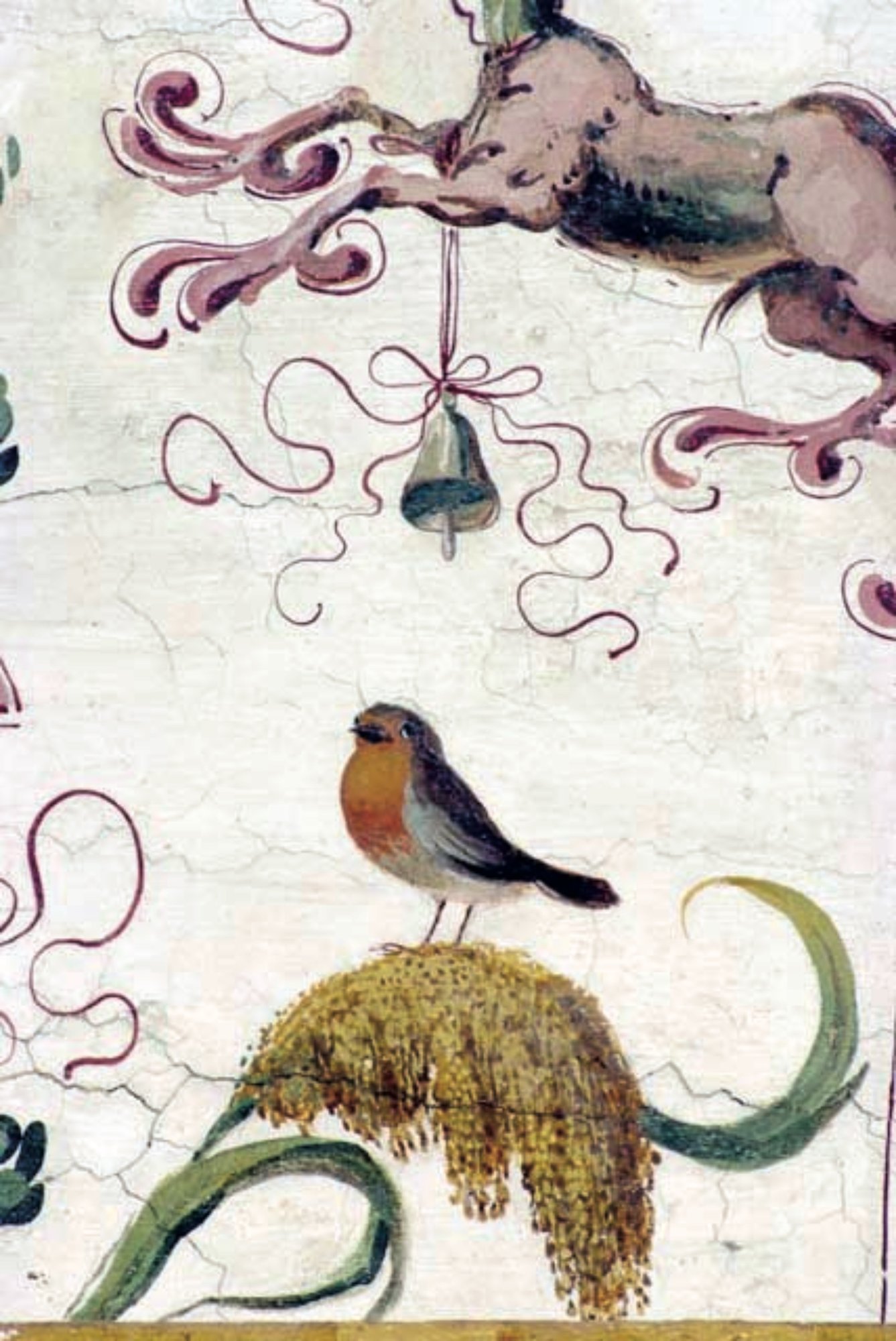 Gli elementi ornamentali del soffitto formano un vero ricamo: racemi stilizzati si intrecciano con festoni e nastri filiformi a sostenere cespi di fiori e frutta, uccellini e leggiadre farfalle. E poi animali di ogni genere – gru, gufi, giraffe, scimmie … – il cui reale significato simbolico a noi ancora sfugge, studiati e rappresentati con l’acume e la precisione del naturalista, ma vivificati dalla fantasia di un vero artista. Animali spesso rari a vedersi in quei tempi a Udine, tanto da destare viva curiosità.