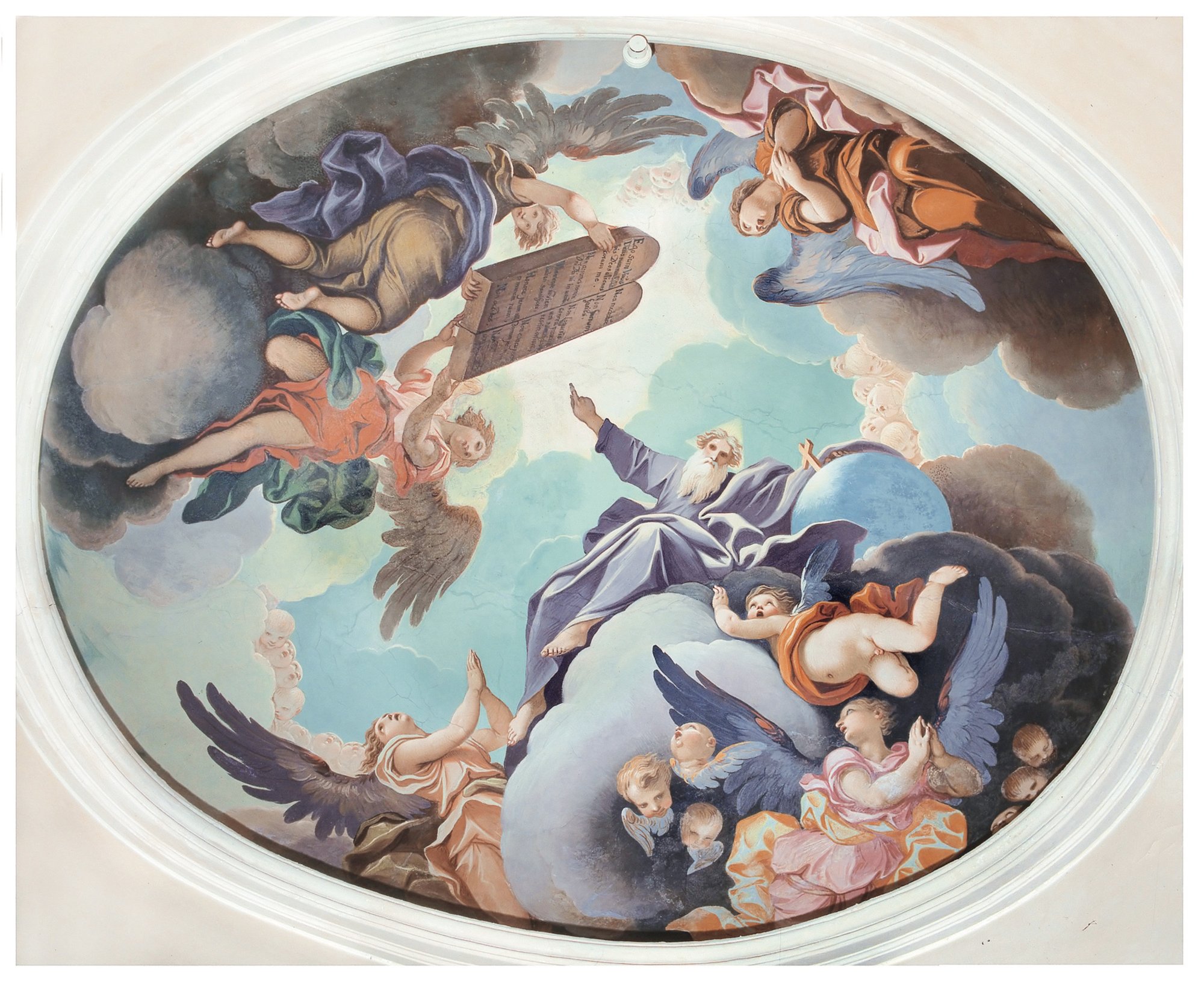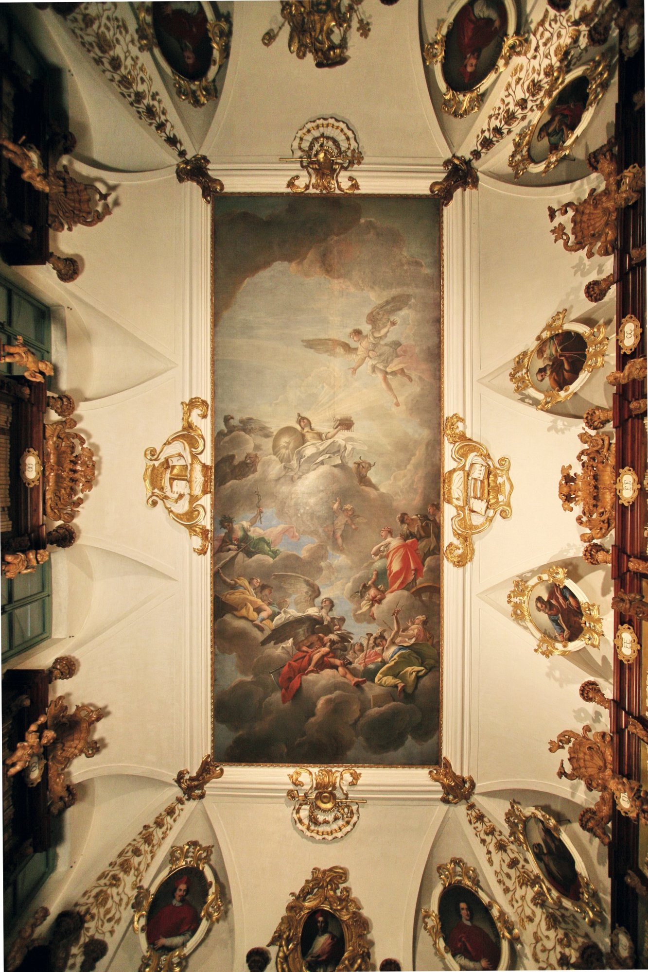 Il soffitto è occupato da un grande “telero” alla veneziana, realizzato nel 1711 dal pittore veneziano Nicolò Bambini (a olio su tela), che rappresenta il Trionfo della Sapienza divina.