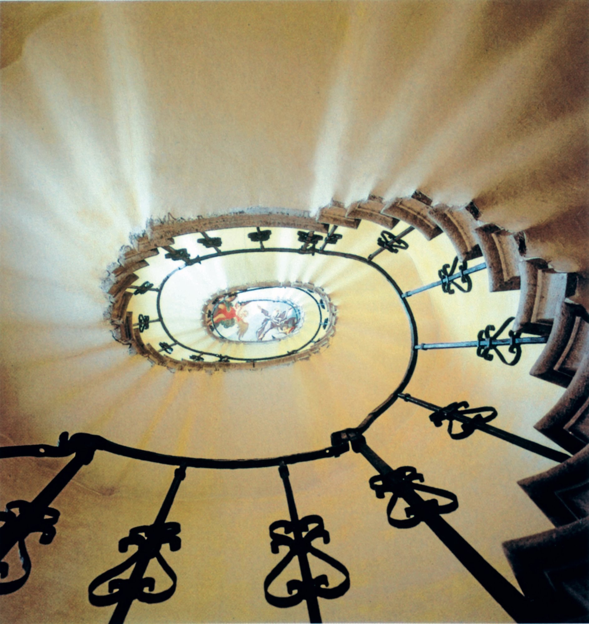 Dalla Biblioteca si accede all’esterno mediante una elegante e suggestiva “scala a bovolo” (cioè a chiocciola), voluta nel 1708 dal patriarca per creare un accesso indipendente alla biblioteca allora in fase di realizzazione. Opera di Domenico Rossi, la scala si conclude in un cupolino decorato con un affresco raffigurante il Divino legislatore in una gloria di angeli, eseguito nel 1709 dal pittore francese Louis Dorigny (1654-1742), che in quel lasso di tempo eseguì affreschi anche nel duomo di Udine e in villa Manin a Passariano.