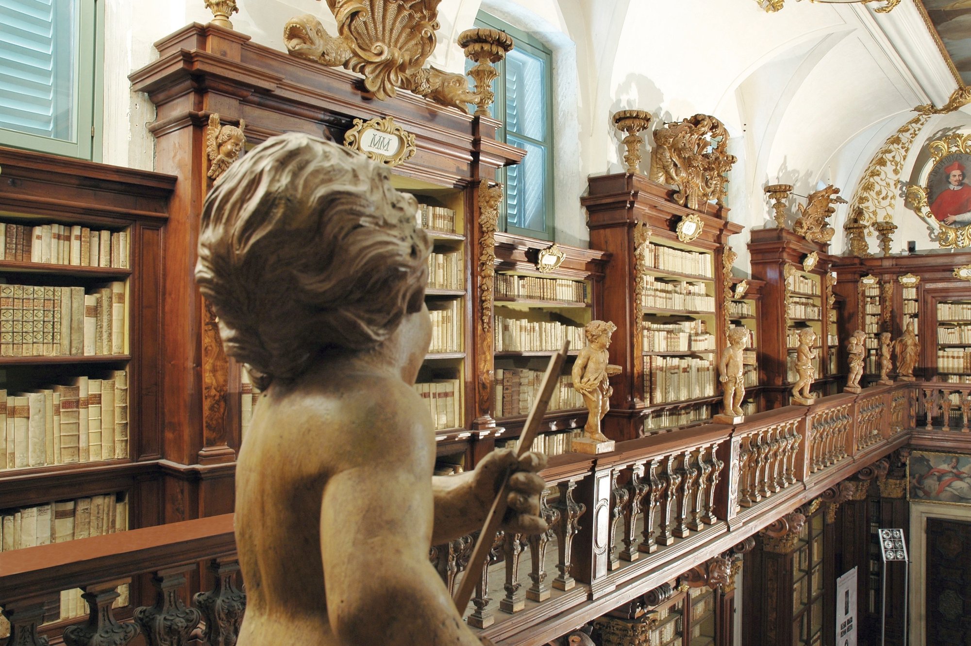 La Biblioteca consiste in una vasta stanza rettangolare interamente ricoperta da scaffalature il legno, su due piani, con ballatoio retto da venti mensoloni poggianti su protome dai volti animaleschi e deformati, mentre sulla sovrastante cornice quattordici putti, in legno scolpito, reggono i simboli delle arti, delle scienze e della fede: agli angoli sono scolpiti, a figura intera, i quattro Dottori della Chiesa occidentale (Ambrogio, Girolamo, Agostino e Gregorio Magno).