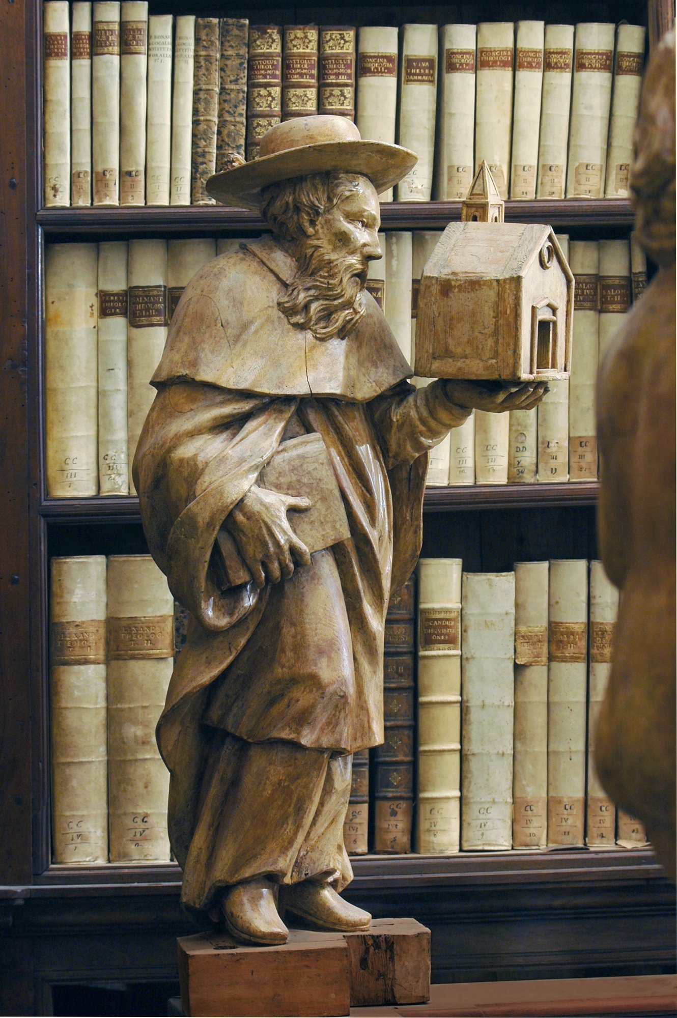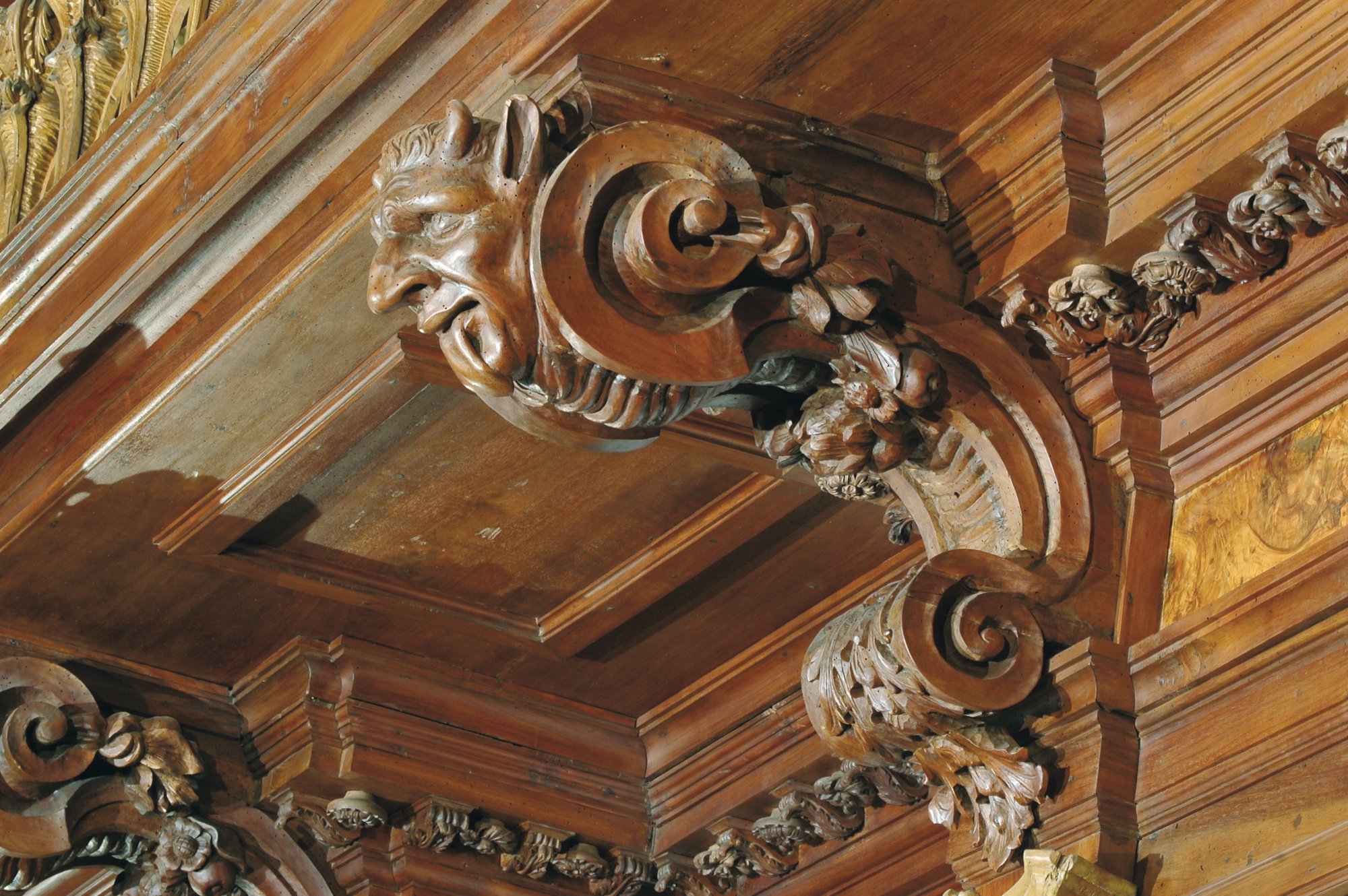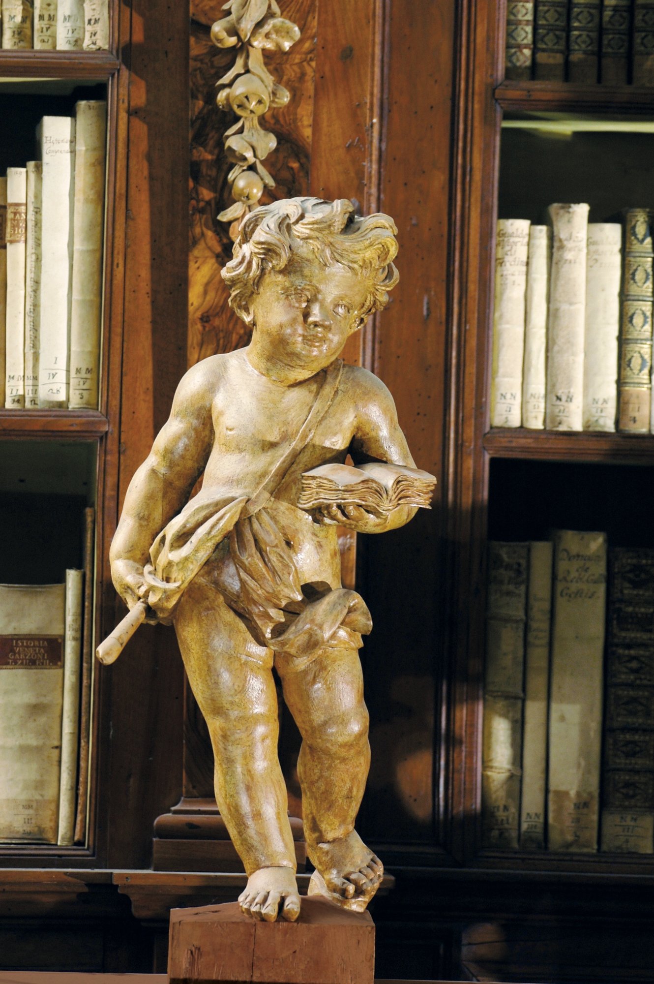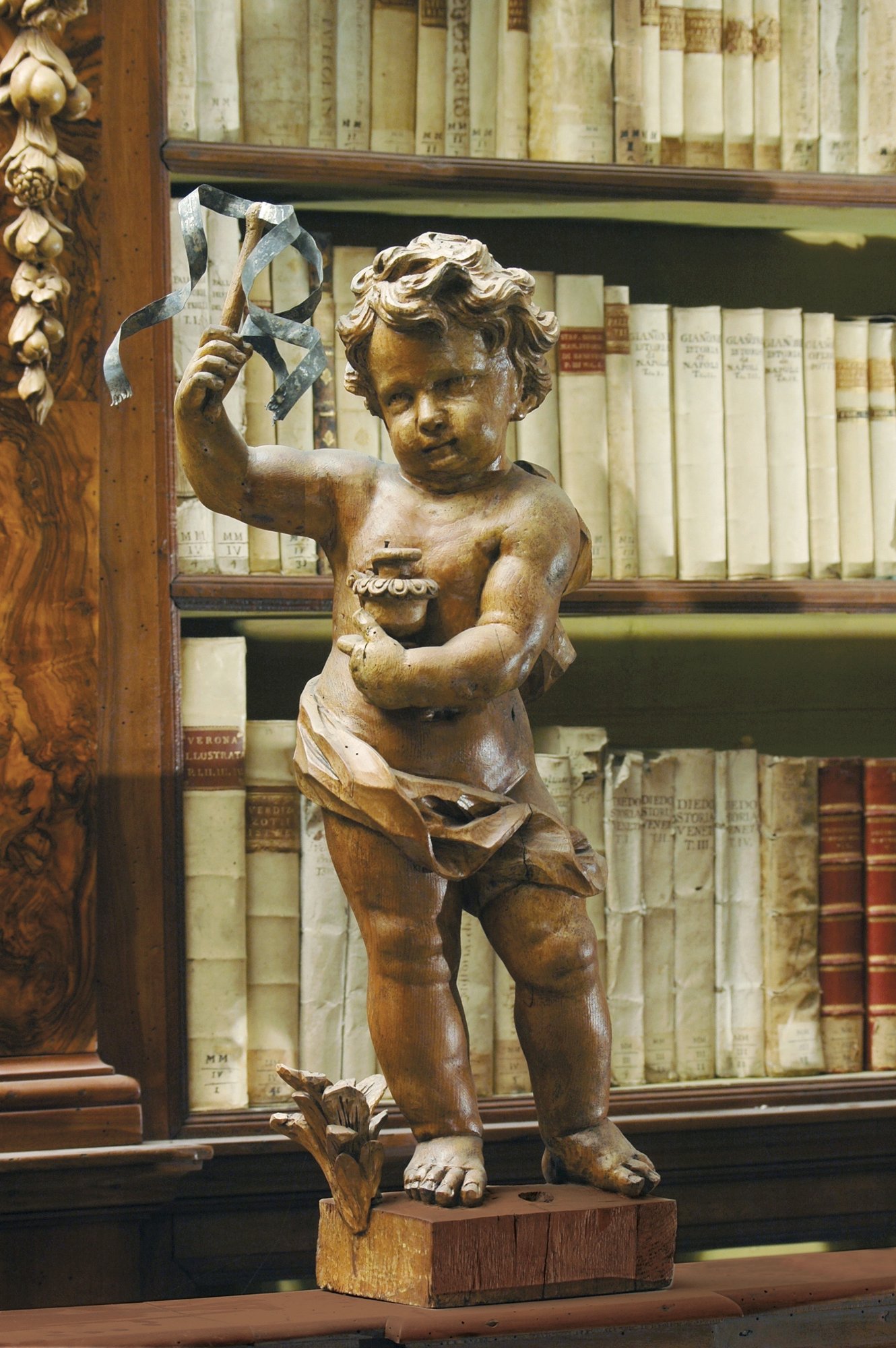 Un preciso intento informatore della committenza sottende la decorazione della Biblioteca: celebrare la Sapienza divina nel suo trionfare sulle deformi manifestazioni dell’Ignoranza. A tale scopo concorrono le singole parti, dagli intagli e sculture lignee alle iconografie allegoriche dei dipinti – essi pure opera di Nicolò Bambini – che fungono da sovrapporta e raffigurano il Trionfo della Dottrina sull’Ignoranza, il Trionfo della Fede sull’Idolatria, il Trionfo dell’Ortodossia cattolica sull’Eresia e il Trionfo della Verità sulla Bugia. Lo stesso intento comunicano le protomi umane e bestiali, delle sculture che decorano le mensole del ballatoio.