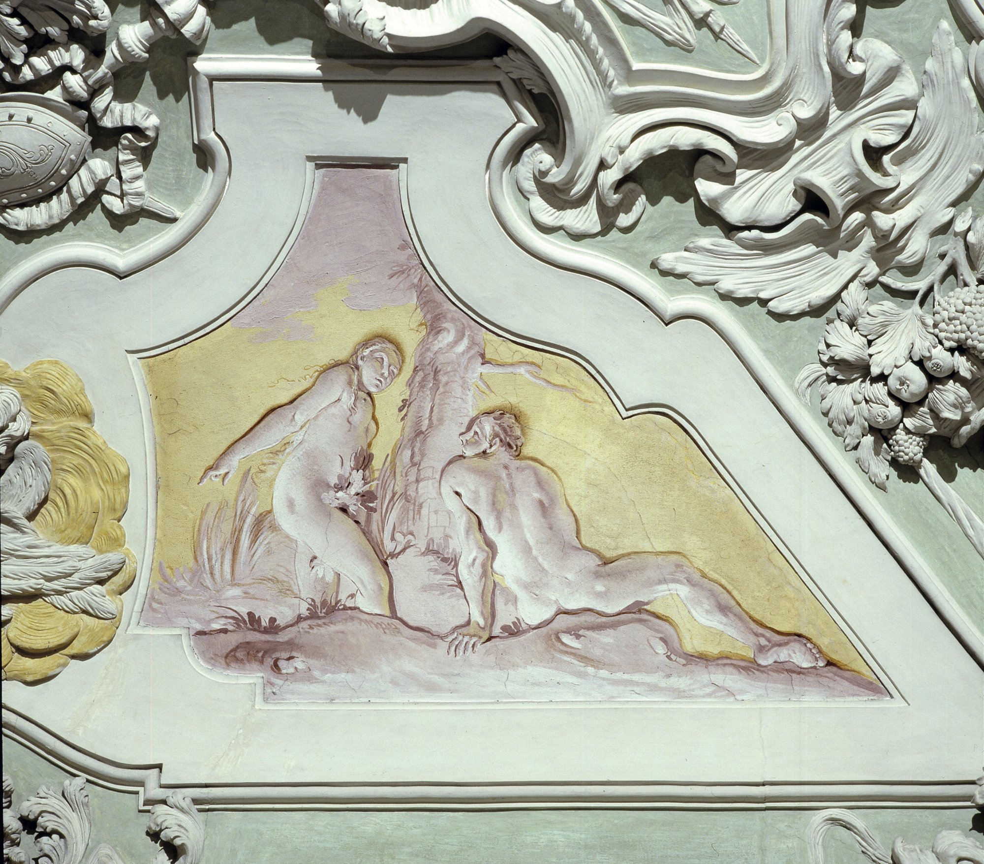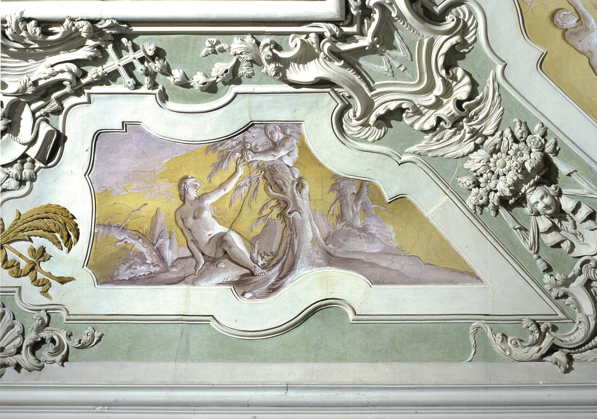 Attorno al dipinto centrale, nel guscione di raccordo con le pareti, tra esuberanti stucchi, Tiepolo illustra i primi capitoli della Genesi: Dio crema Adamo, Dio crea Eva, Il serpente seduce Eva, Eva consegna la mela ad Adamo, Adamo ed Eva prendono coscienza della loro nudità, Dio crea Adamo ed Eva, Dio condanna ed Eva, L’angelo caccia Adamo ed Eva dal paradiso.