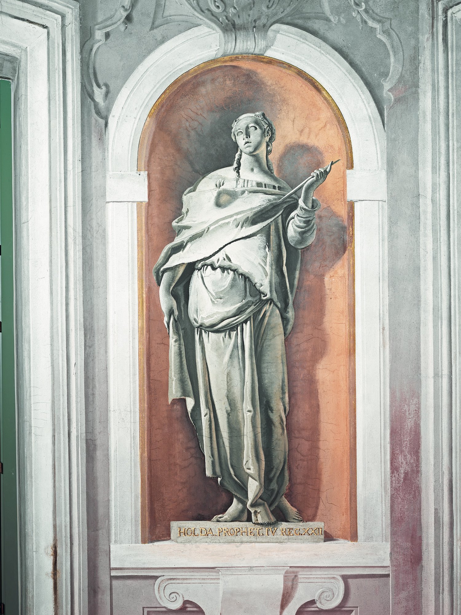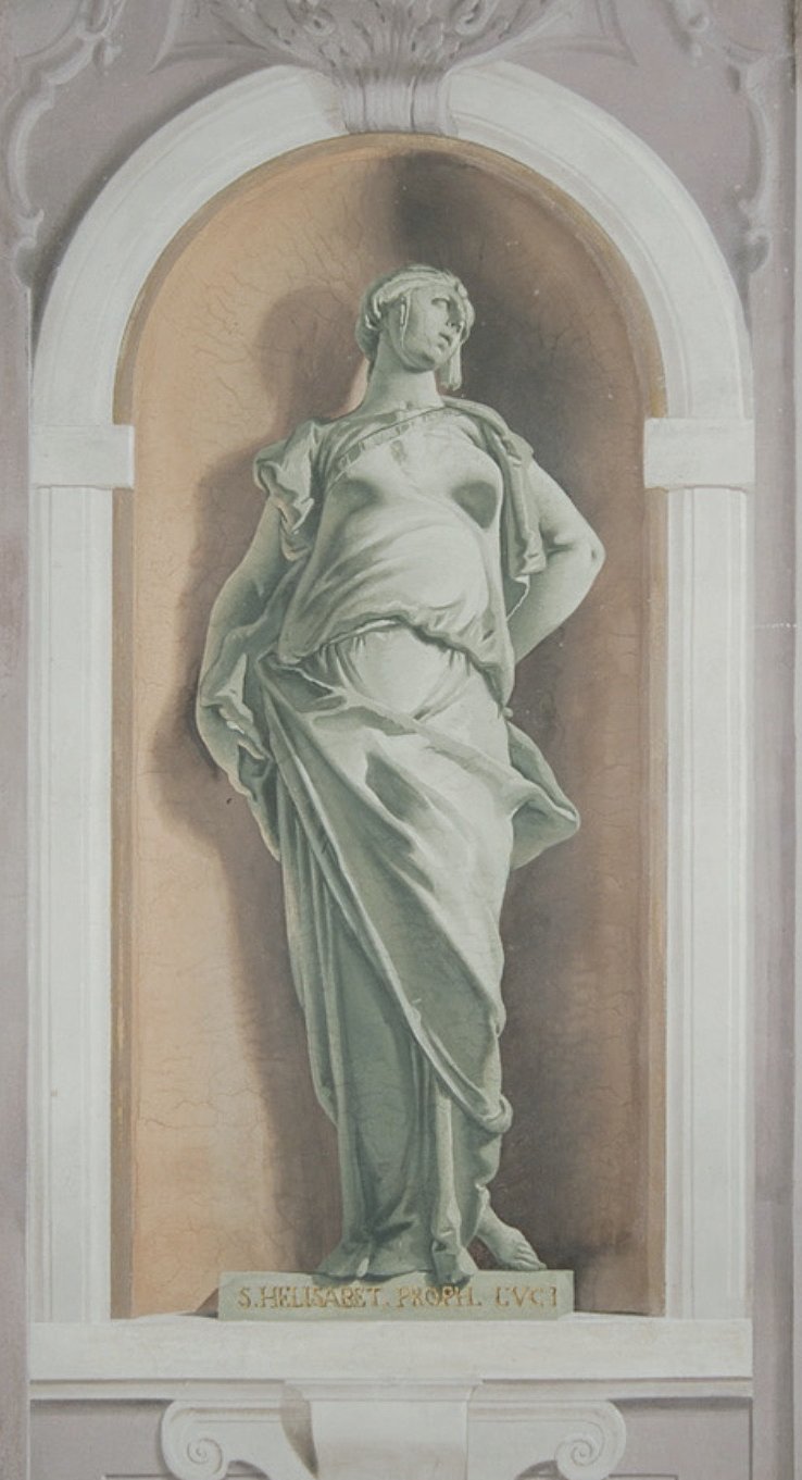 Eleganti, isolate entro nicchie, trattate a monocromo, simili a statue, sono le sei Profetesse che hanno saputo vedere prima degli altri il futuro del genere umano. Quattro sono poste fra le finestre (Anna, figlia di Fanuele, Elisabetta, moglie di Zaccaria e madre di Giovanni Battista, Anna, madre di Samuele, Holda o Culda, moglie di Sallum), due sulla parete principale (Marta, sorella di Aronne e Debora).