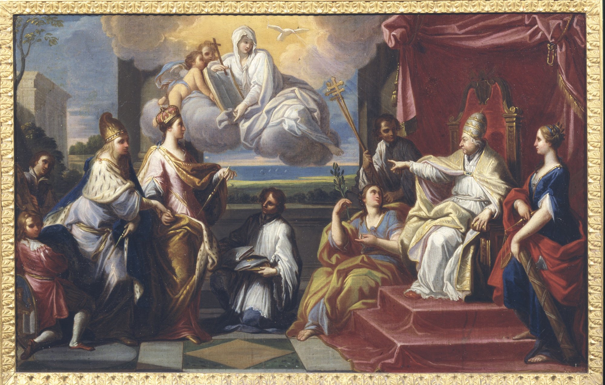 Nel “telero” di Nicolò Bambini al centro della composizione è posta la Sapienza, ritratta come una classica Minerva, con il libro delle profezie chiuso dai sette sigilli, sormontato dall’Agnello pasquale nella mano sinistra e li scudo illuminato dalla Colomba dello Spirito Santo nella destra. Il cimiero che le copre il capo è sormontato da un gallo, emblema della Ragione.