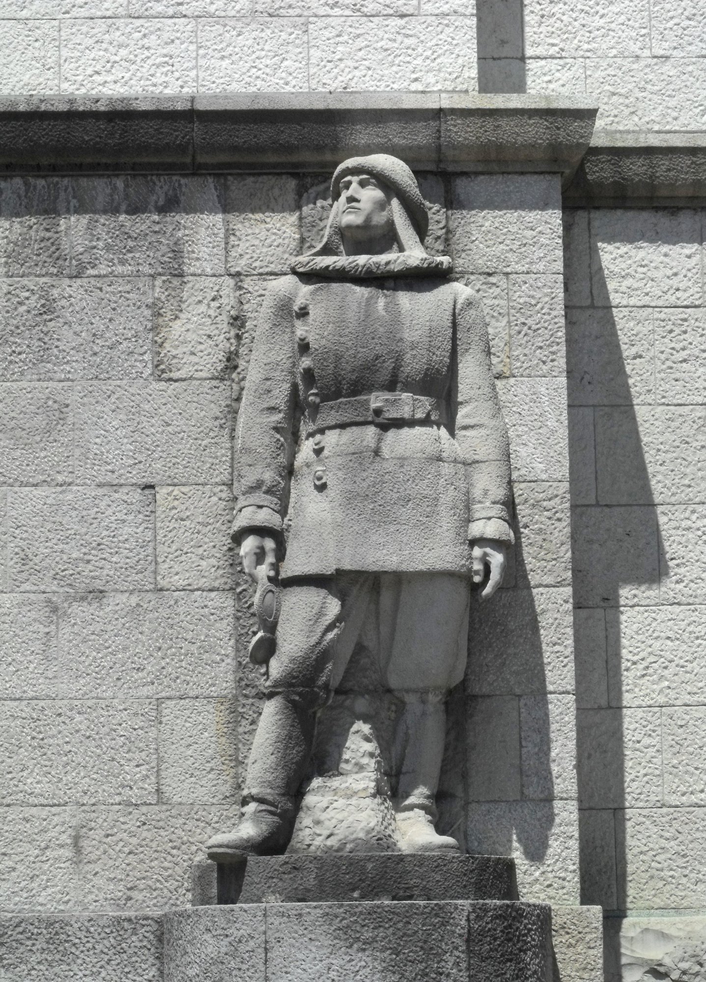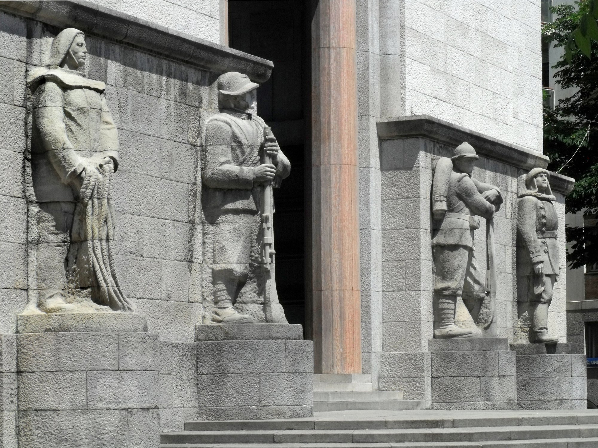 Punto di attrazione della facciata sono le statue raffiguranti il Marinaio, l’Alpino, il Fante e l’Aviatore inquadrate dalla grande fascia basamentale. I modelli in gesso furono realizzati da Silvio Olivo (Villaorba di Basiliano 1909 – Udine 1999), che nel 1938 risultò vincitore del concorso bandito dalla Provincia di Udine. I modelli in gesso, dalle dimensioni monumentali di circa 3 metri, furono disposti in fila lungo la navata centrale del Tempio, ma si dovette aspettare fino al 1952 per la traduzione in pietra piasentina, ad opera dello scultore gemonese Luigi Pischiutti (Venezia 1896 – Udine 1952) e dagli allievo, ma furono eseguite in una scala minore di quella prevista.