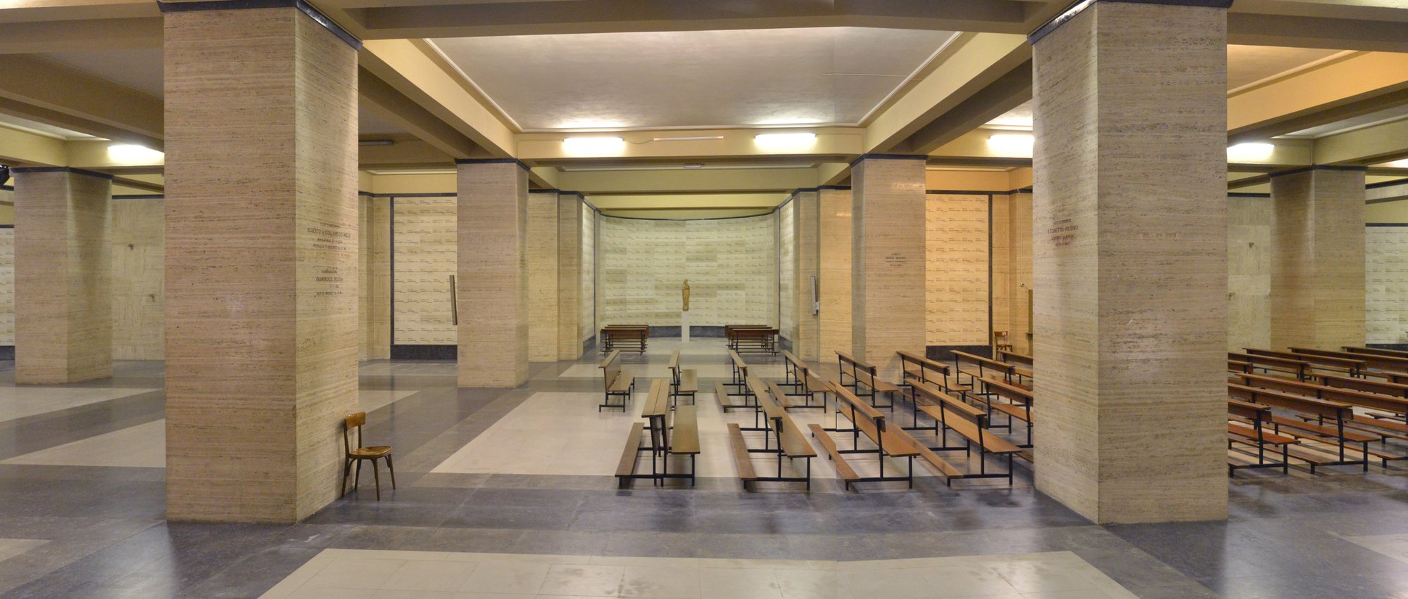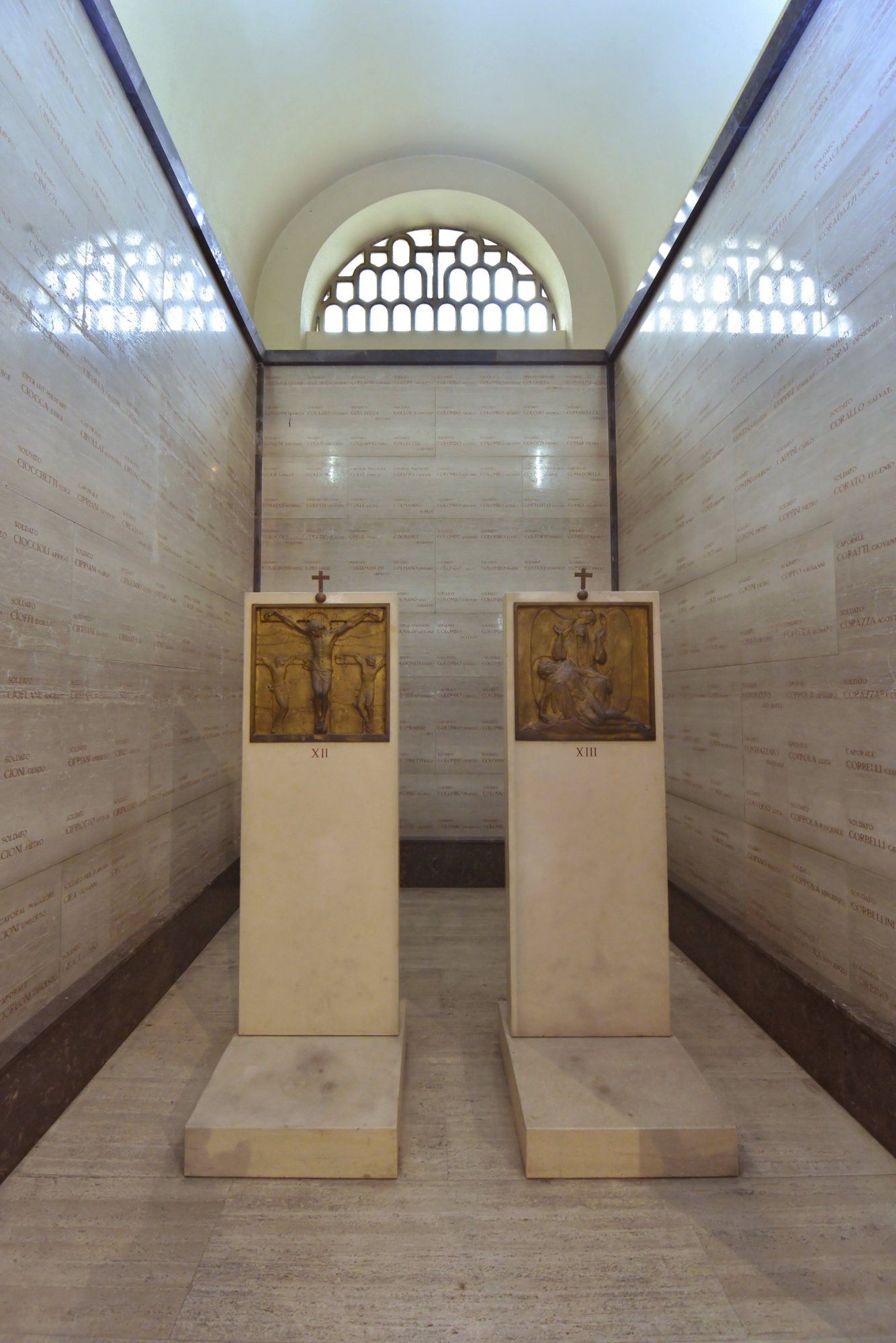 Dietro il presbiterio si scende, attraverso due rampe rivestire di marmi nero, nella cripta, interamente ricoperti dai loculi dei Caduti. Al termine della prima rampa, dove le scale si uniscono, si trova la tomba di monsignor Cossettini, ideatore e primo parroco del Tempio.