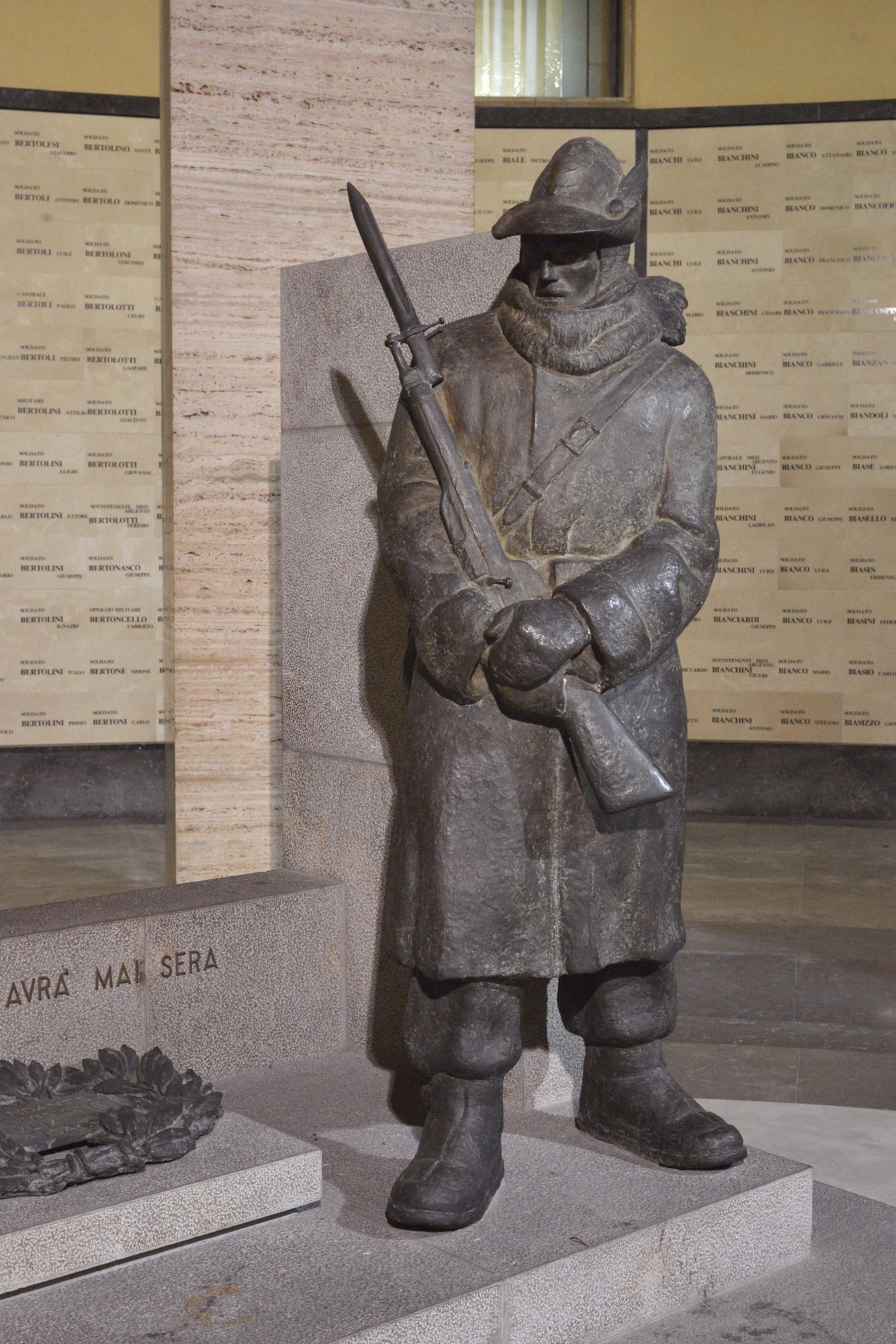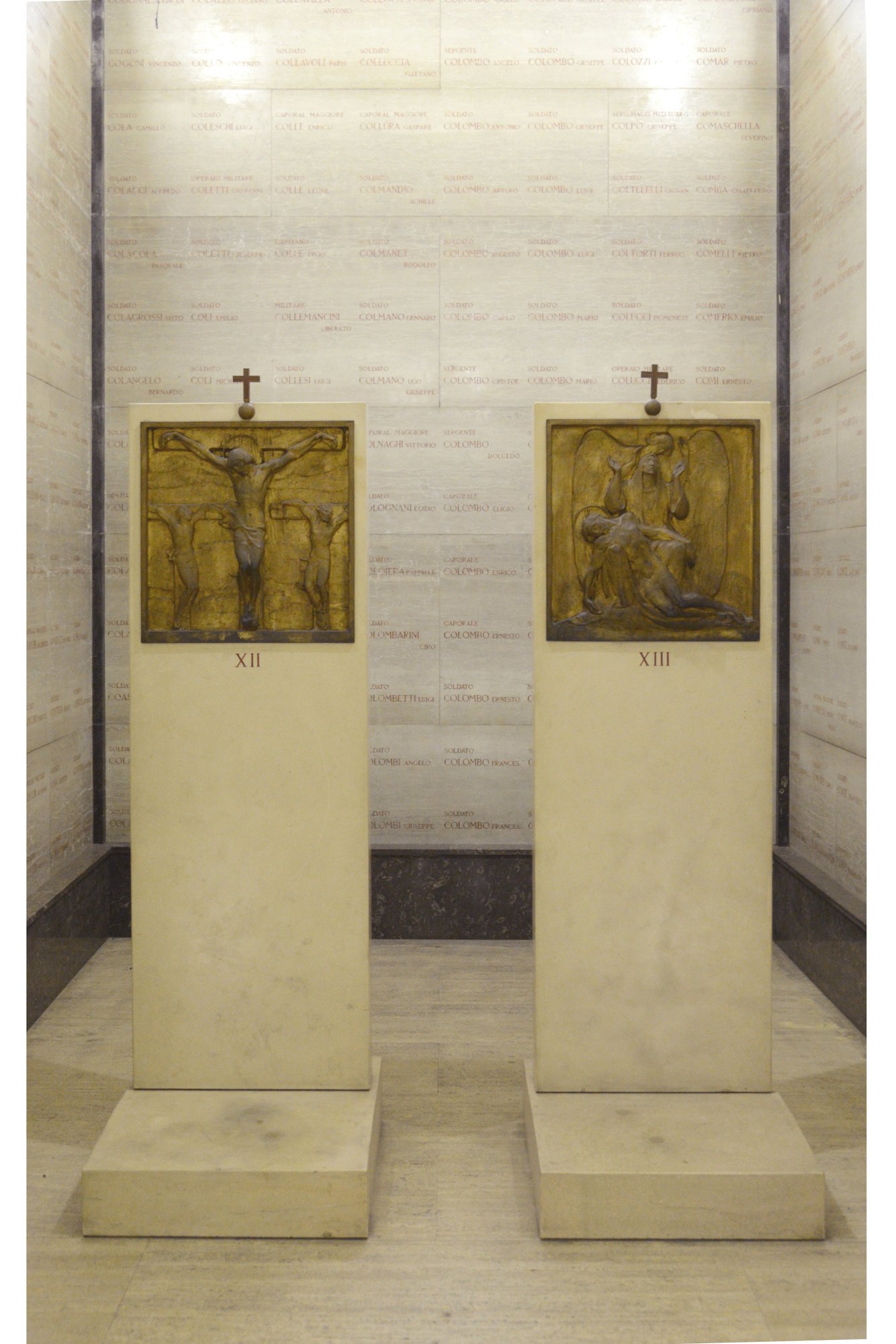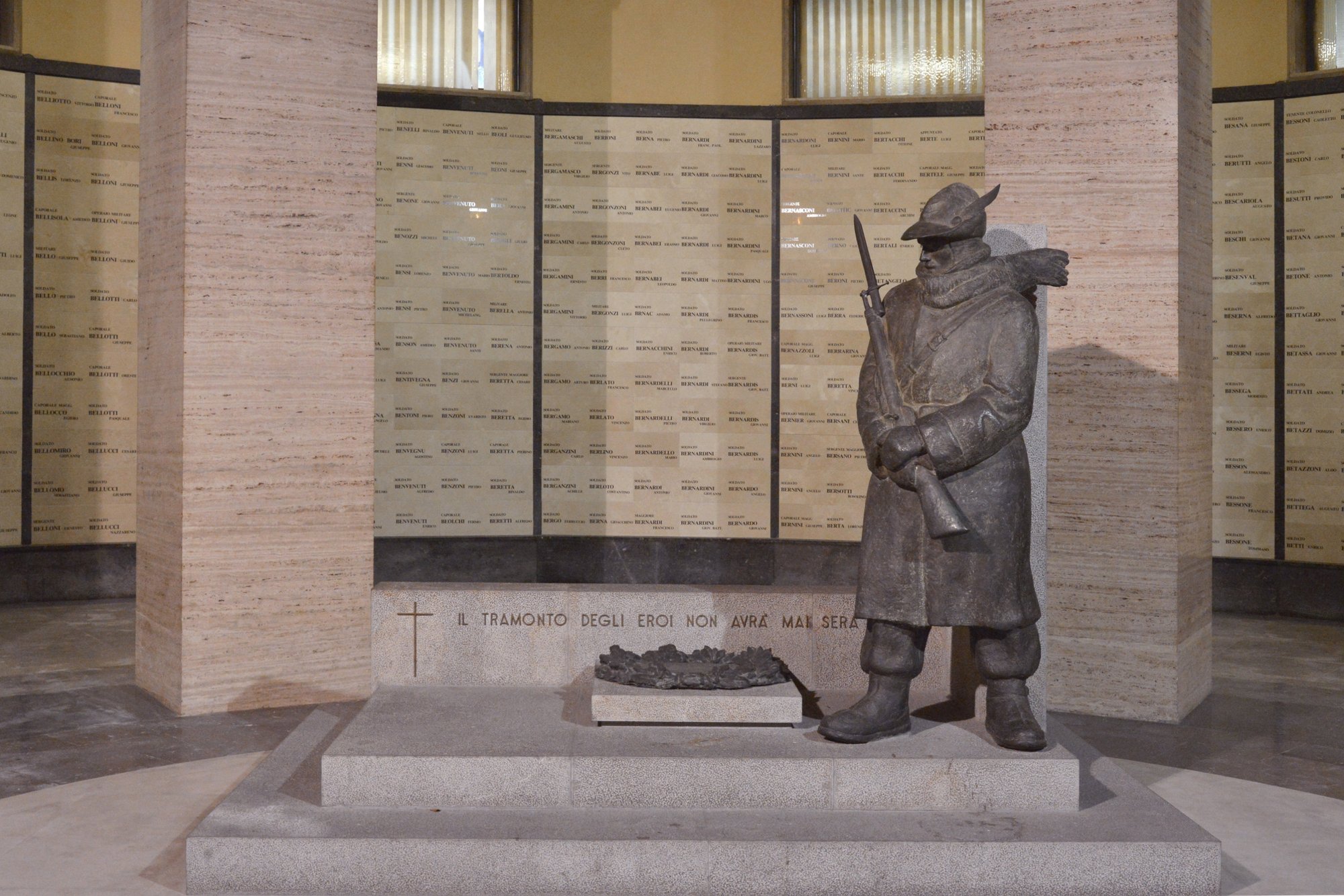 Percorrendo un’altra rampa si scende nella cripta sorretta da 20 pilastri in travertino: ai lati dell’ingresso si aprono due ossari, in cui furono tumulati i resti di 5.000 soldati senza nome, con l’epigrafe ET NOMEN/ UNA CUM SANGUINE/ PRO PATRIA/ DEDIMUS (Insieme alla vita offrimmo alla Patria il nome). Sulla sinistra si trova un ricordo dedicato alla epopea della Divisione Julia in Russia durante la Seconda guerra mondiale. La statua dell’alpino fu fusa in bronzo dallo scultore torinese Emilio Musso e posta in opera il 2 novembre 1958.
