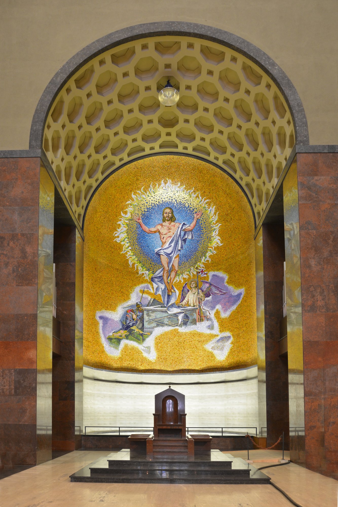 Il catino absidale è decorato con un grande mosaico su fondo dorato, raffigurante la Resurrezione di Cristo dal sepolcro, un soggetto che si deve porre in relazione con il Crocifisso di Mistruzzi sull’altare, intendendo riproporre una riflessione cristiana sulla Resurrezione dei defunti, quanto mai adatta al Tempio.