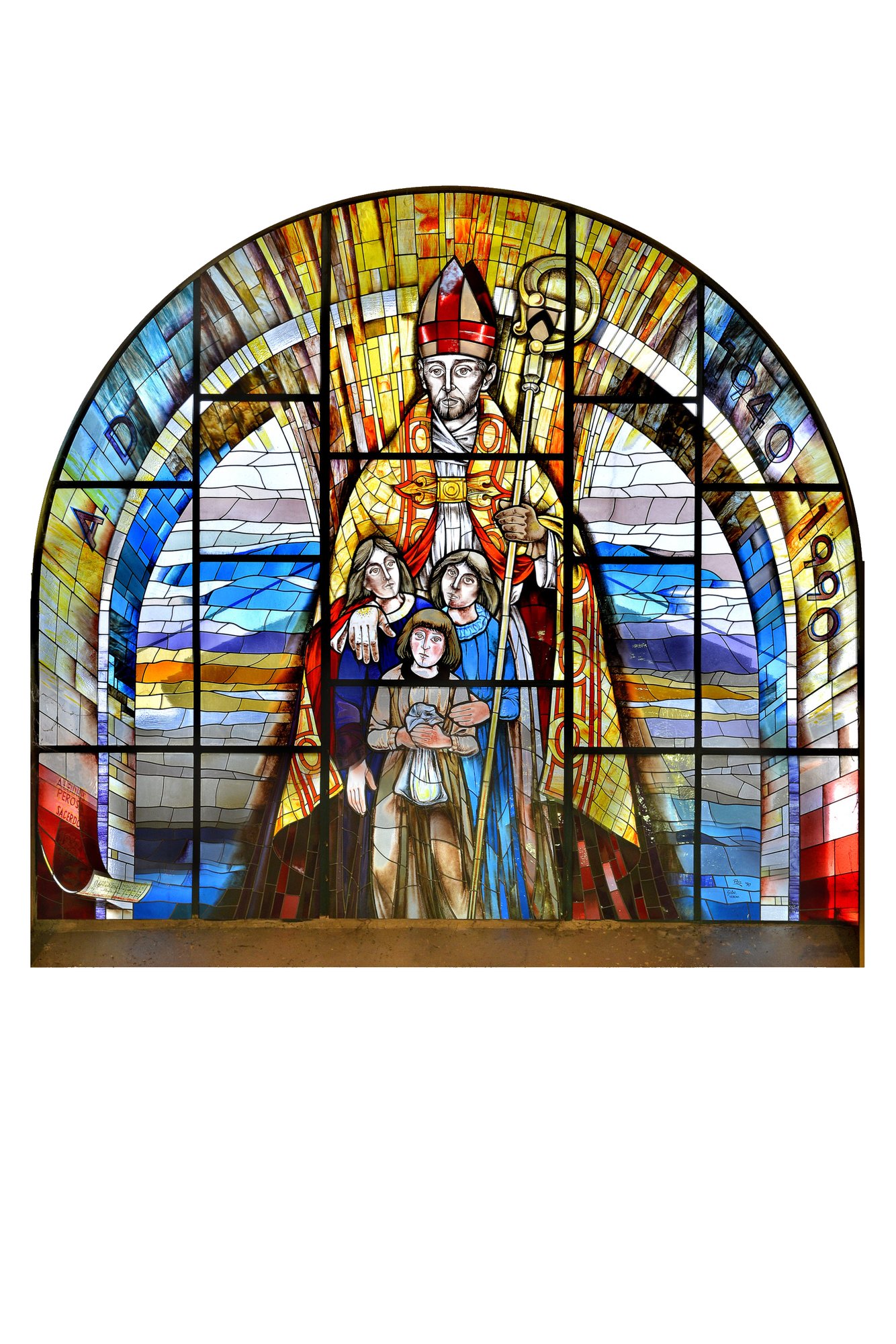 Dalla controfacciata si vede la vetrata istoriata a piombo eseguita da Arrigo Poz (1929 – 2016) nel 1990, in occasione del cinquantenario del Tempio, entro un poderoso arcone, raffigurante San Nicoò, titolare dell’antica chiesa, che protegge un gruppo di bambini.