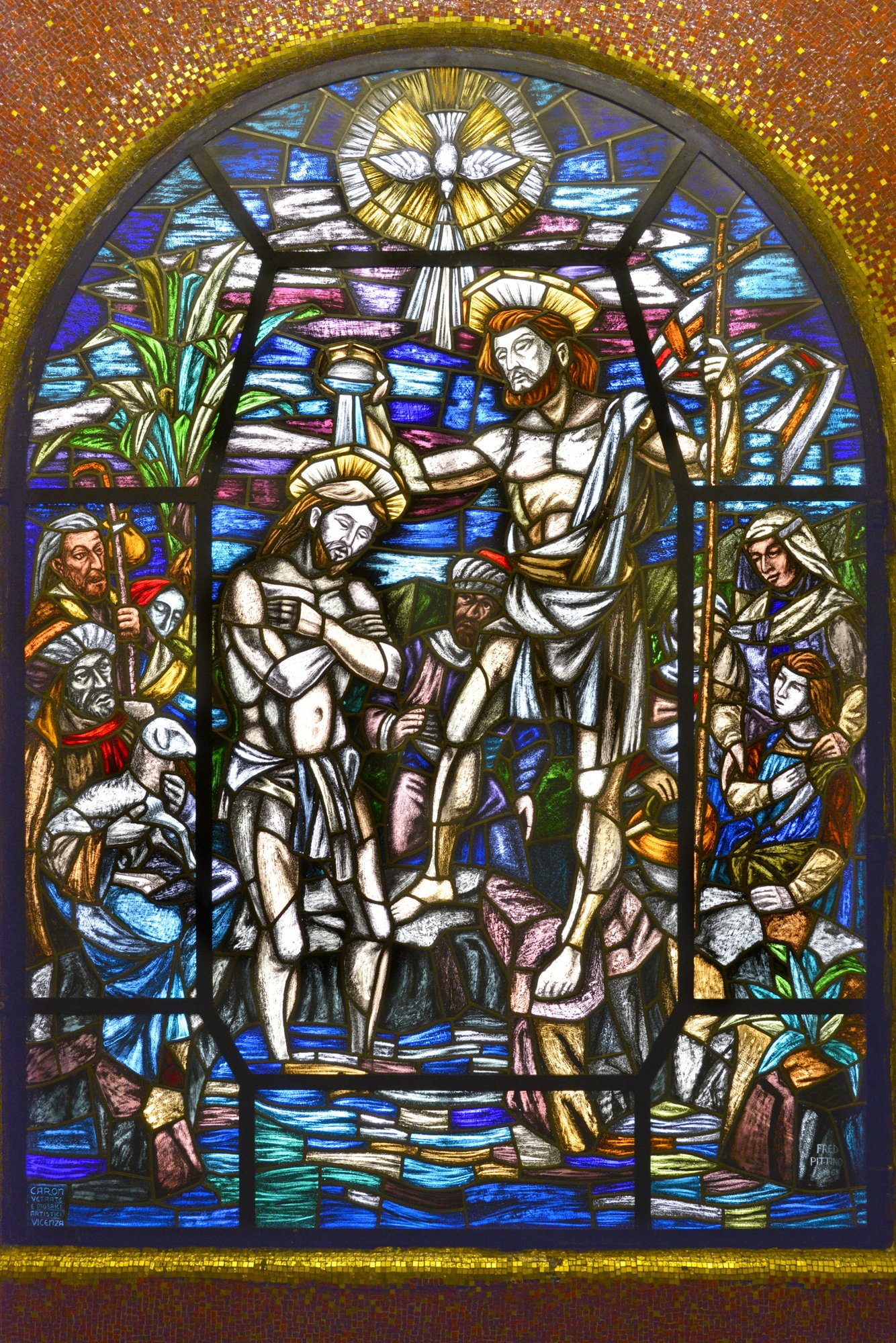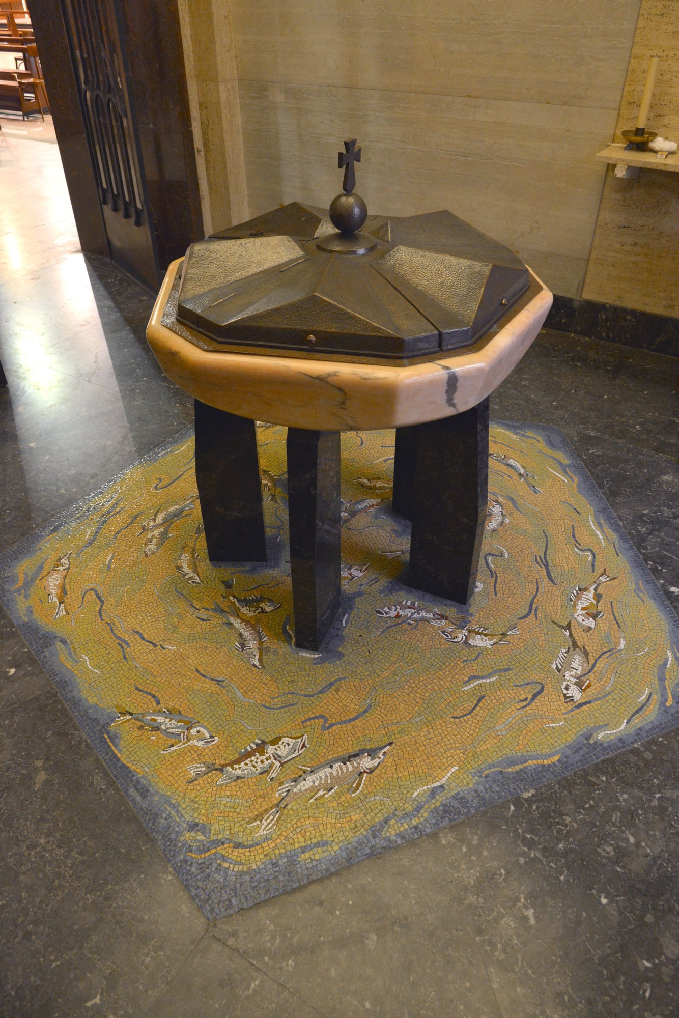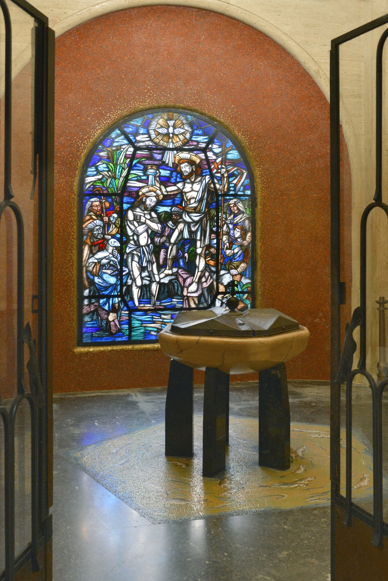 Il 24 maggio 1961 fu inaugurato il battistero e anche in questo caso il progetto fu opera di Fred Pittino. Esso sostituiva il sacello, costituito da 8 tombe di marno, che nel 1937 era stato dedicato ai caduti fascisti, smantellato dopo il 1945. Nel vano, chiuso da un cancello in ferro battuto e bronzo, con simboli dell’acqua lustrale, Fred Pittino eseguì sul fondo una vetrata raffigurante il Battesimo di Cristo, con dei vetri colorati dalle tonalità fredde e grisaille per meglio rendere i volumi. Al centro del pavimento in marmo nero, eseguì un mosaico pentagonale con dei pesci che alludono alle acque del Giordano da cui escono 5 colonne a reggere la vasca battesimale in onice rosa del Portogallo. Le pareti sono rivestite in repen e travertino, mentre lungo la cupola in mosaico dorato che chiude lo spazio si legge una frase di Venanzio Fortunato alludente al mistero del Battesimo.