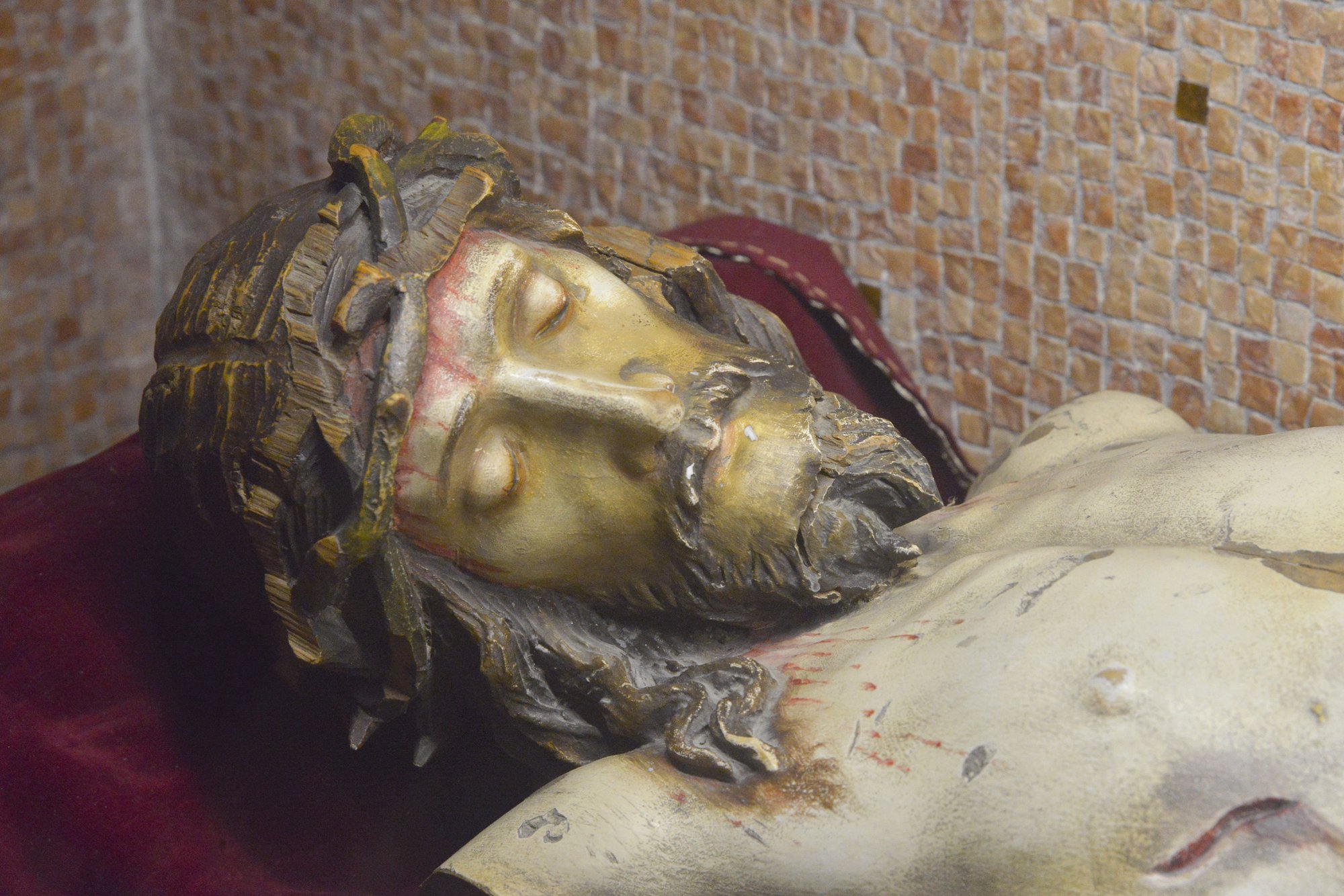 Nella parte retrostante, in una nicchia appositamente ricavata, si venera un Crocifisso, mutilato dalle granata e ritrovato nel Santuario di Monte Santo di Gorizia.