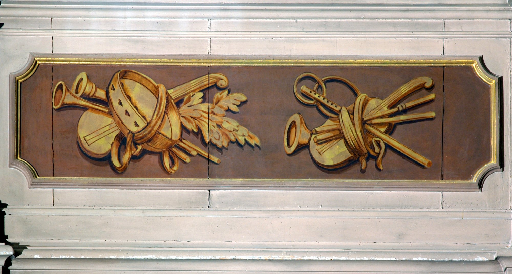 Elegante è il parapetto del cassone originale con le specchiature dipinte a monocromo con strumenti musicali coronati da seri di alloro e di quercia.
