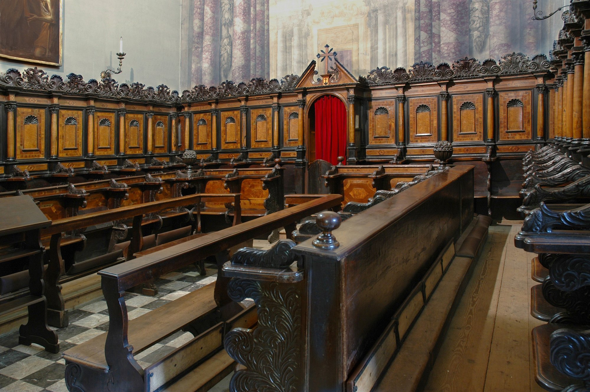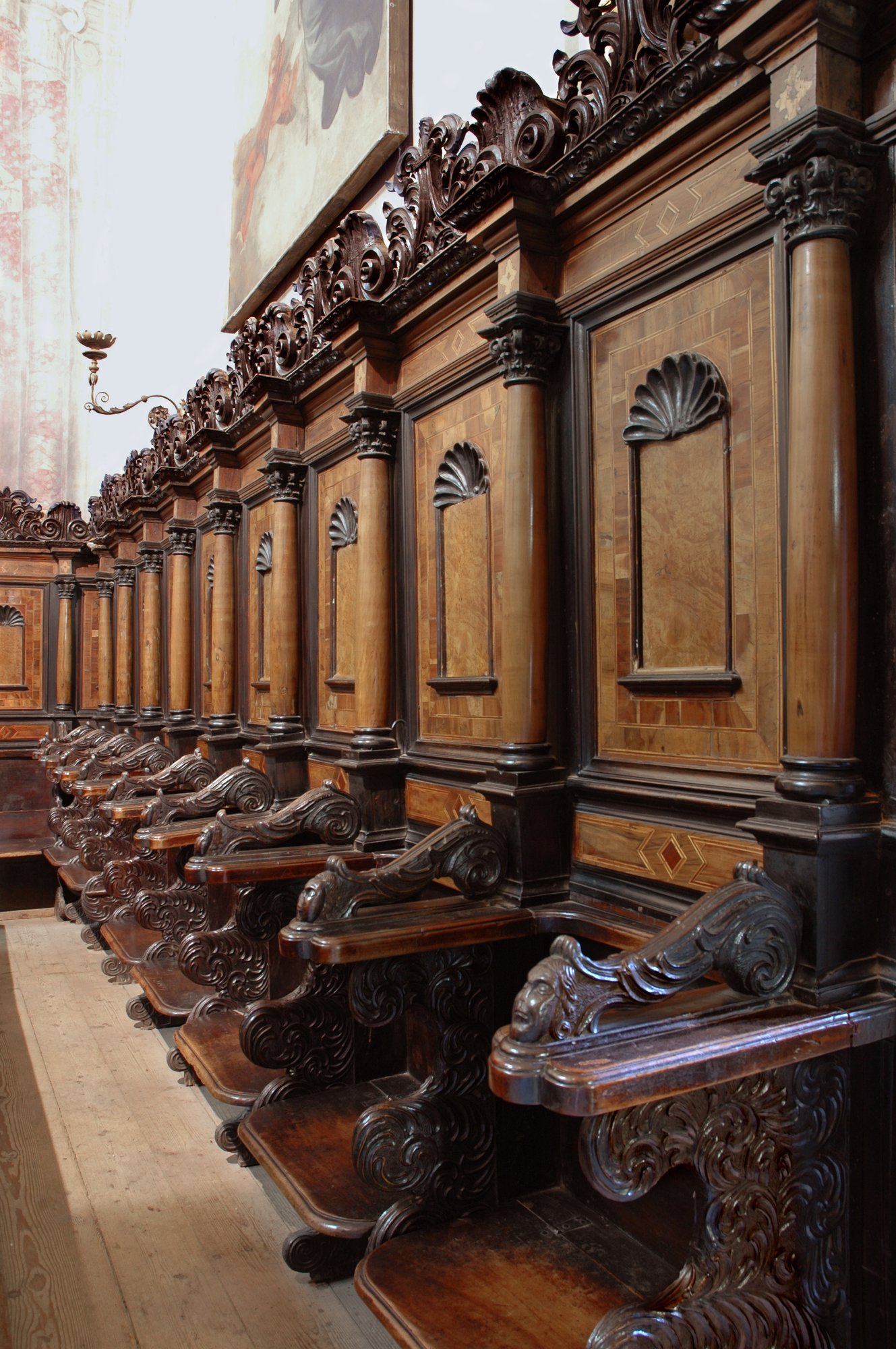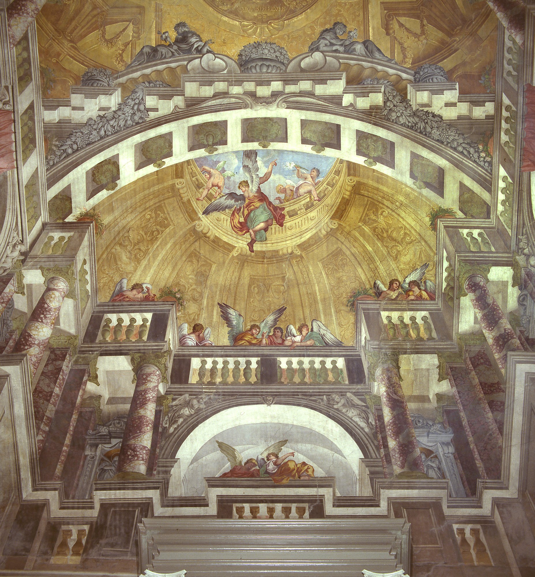 Sulla parete di fondo lo spazio è dilatato illusoriamente da prospettive architettoniche che si interrompono in basso per l’inserimento degli stalli lignei del coro.