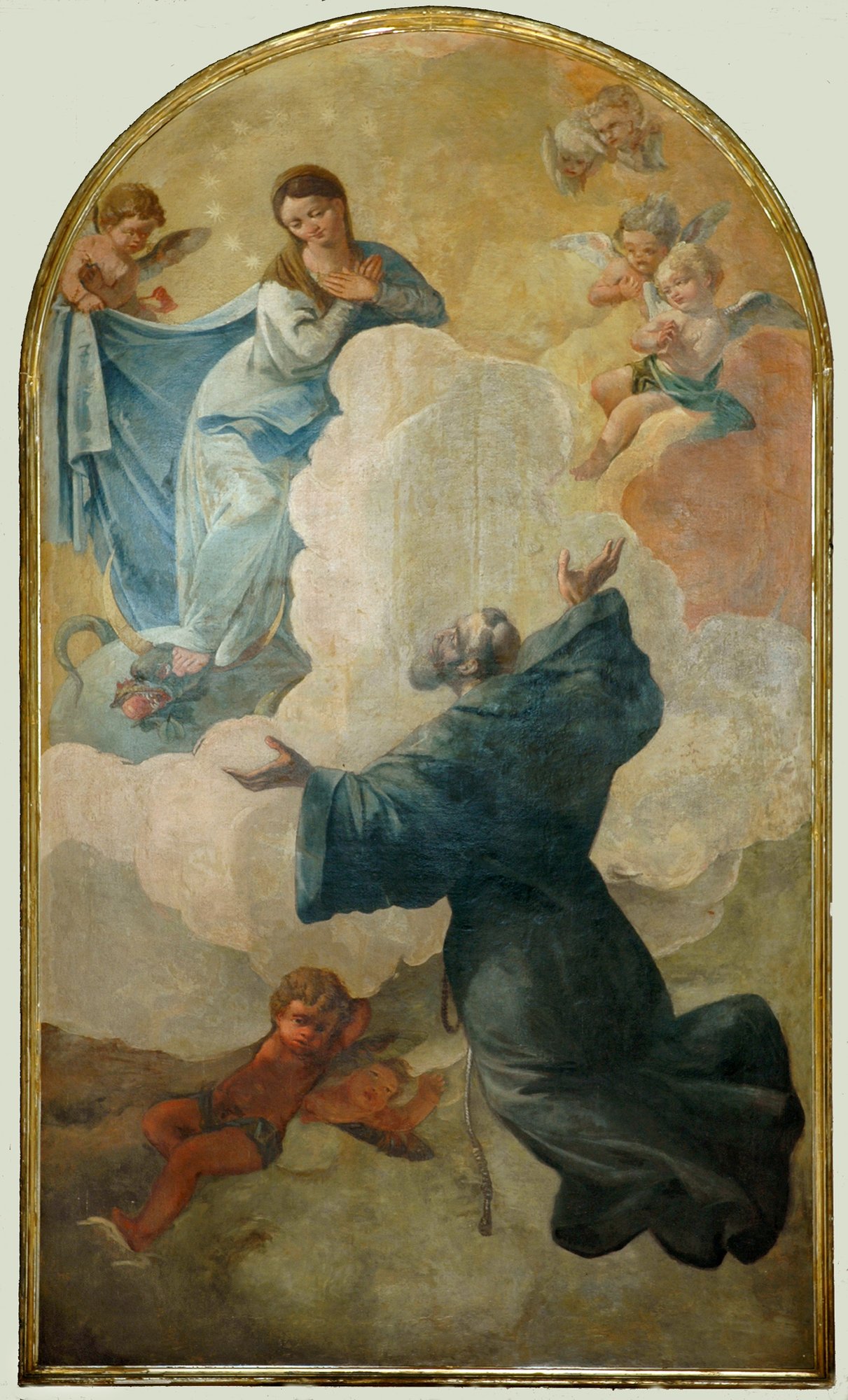 Sulla parete a destra si trova il dipinto dell’abate Francesco Grillo con La Vergine che appare a san Giuseppe da Copertino, membro dei Francescani conventuali, beatificato da papa Benedetto XIV nel 1763 e canonizzato nel 1767. L’opera fu quindi eseguita dopo il 1771, in seguito all’arrivo in borgo Aquileia dei Francescani. Poco si sa del pittore Grillo (ritenuto originario di San Martino di Valvasone, oggi San Martino al Tagliamento), ma certamente conobbe la pittura veneziano del suo tempo, avendo visto disegni e stampe di Gaspare Diziani e soprattutto di Francesco Fontebasso.