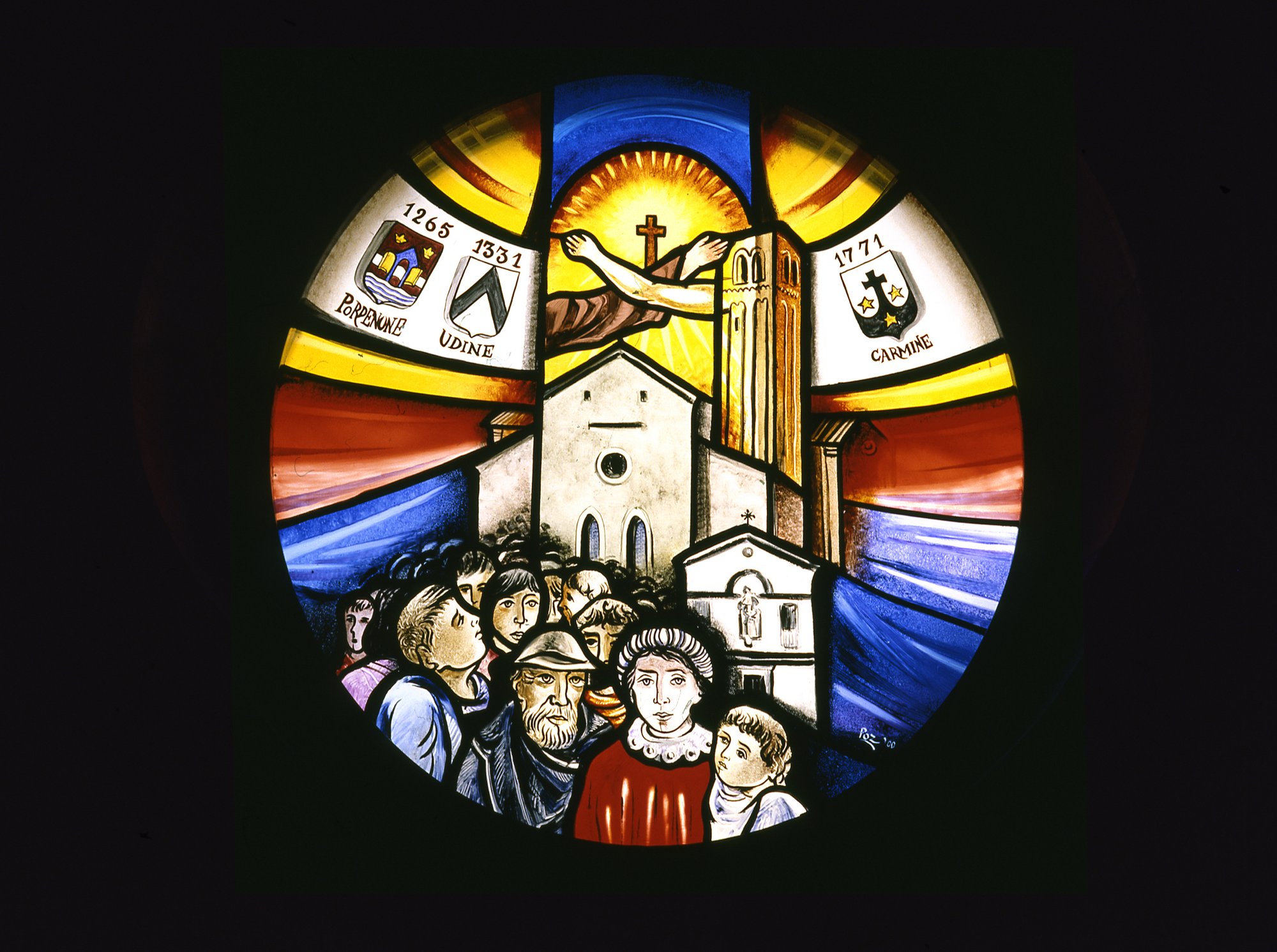 In quella del beato l’artista racconta tre momenti della sua vita di Odorico: nel tondo centrale è raffigurato Odorico, nella vetrata di sinistra la predica in Cina e in quella di destra la processione per trasferire l’Arca dalla chiesa di San Francesco a quella del Carmine in borgo Aquileia.