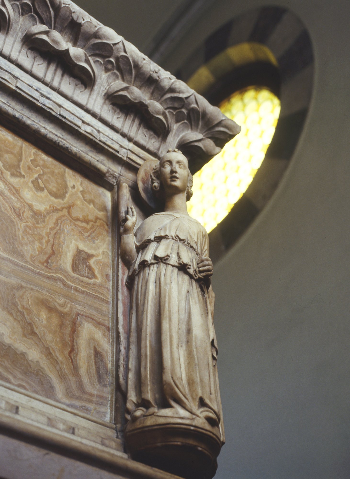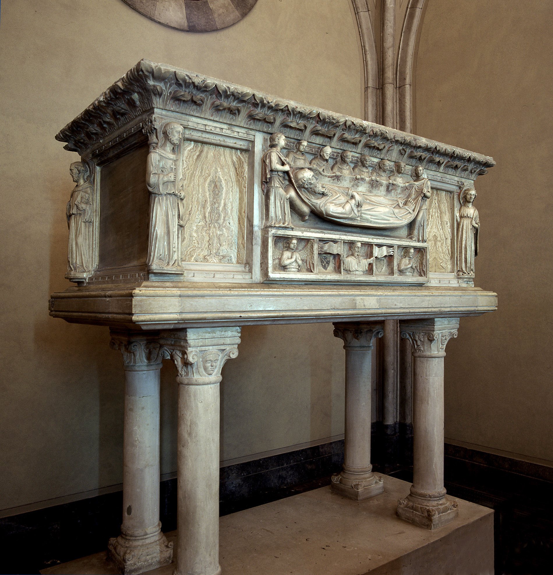 Il cassone marmoreo, ora collocato nella cappella di sinistra, poggia su quattro colonne lisce ed è concluso in alto da una elegante cornice scolpita a foglie.