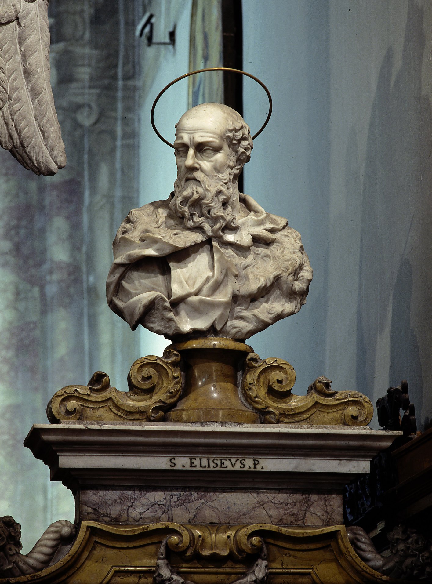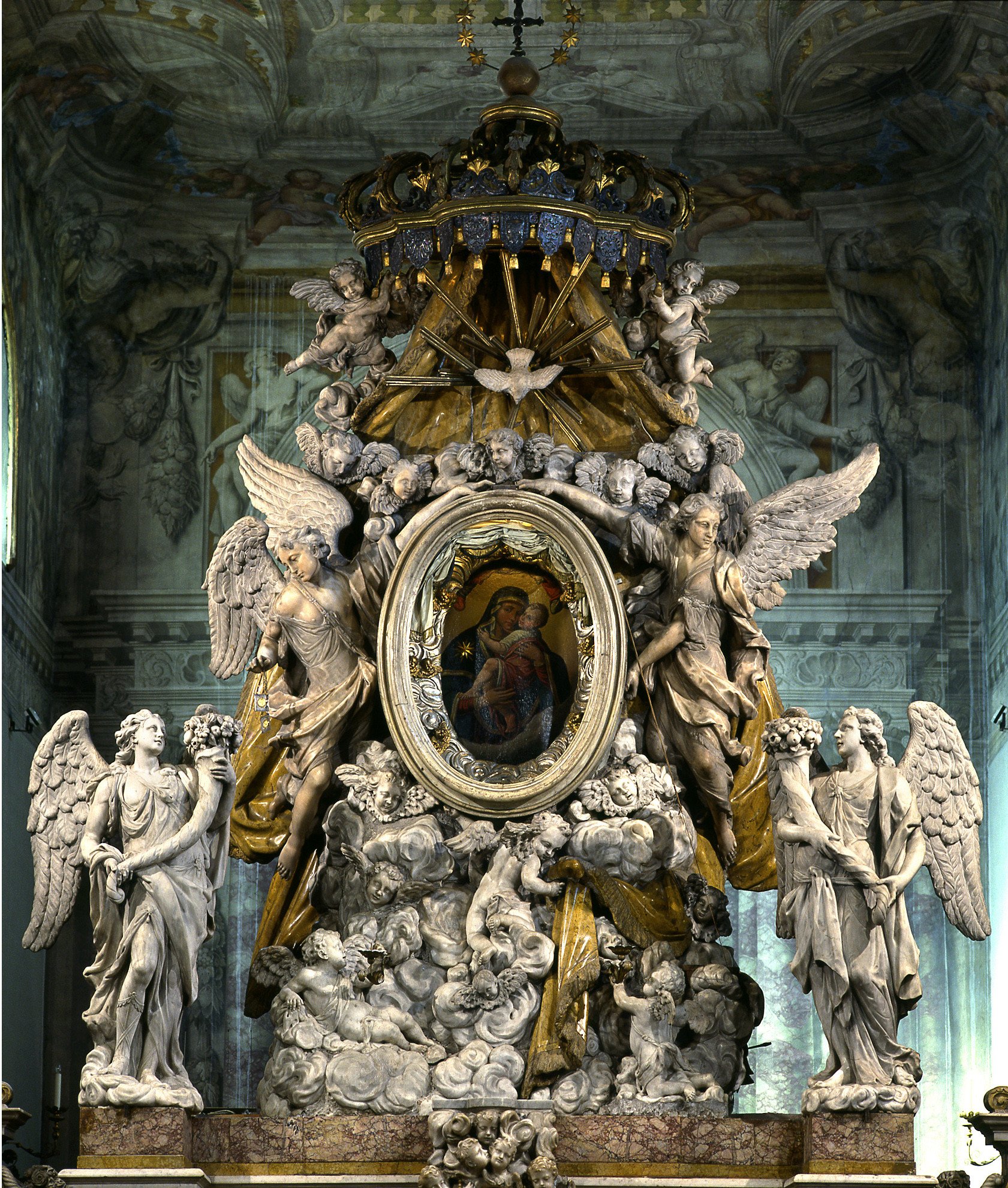 La fastosa composizione si conclude con un grande baldacchino dorato che accoglie la colomba dello Spirito Santo. Ai lati si aprono due le due porte di accesso al coro, in marmo giallo, sopra cui sono posti i busti dei profeti Elia ed Eliseo, cari all’ordine Carmelitano.