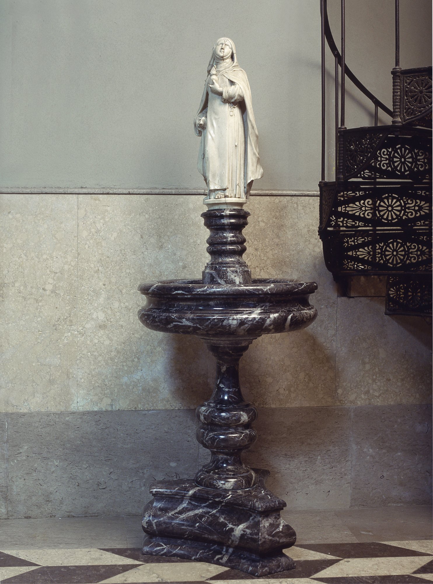 Le due acquasantiere di Giovanni e Francesco Bonazza, con colonna a balaustro, presentano sopra la vasca in marmo grigio, due statue di elegante fattura in marmo di Carrara raffiguranti due santi Carmelitani: Sant’Alberto di Gerusalemme, primo legislatore dell’Ordine, e Santa Teresa d’Avila, fondatrice delle Carmelitane scalze.