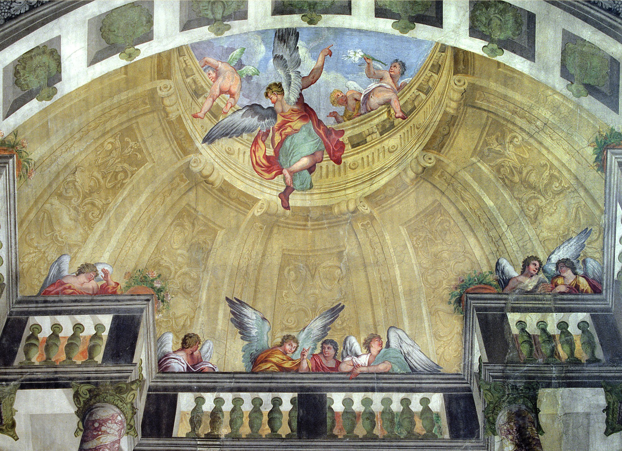 Sulle pareti intorno corre il fregio a monocromo: tra figure di erme, putti e angeli, entro medaglioni, sono narrati Episodi dell’Ordine del Carmelo.