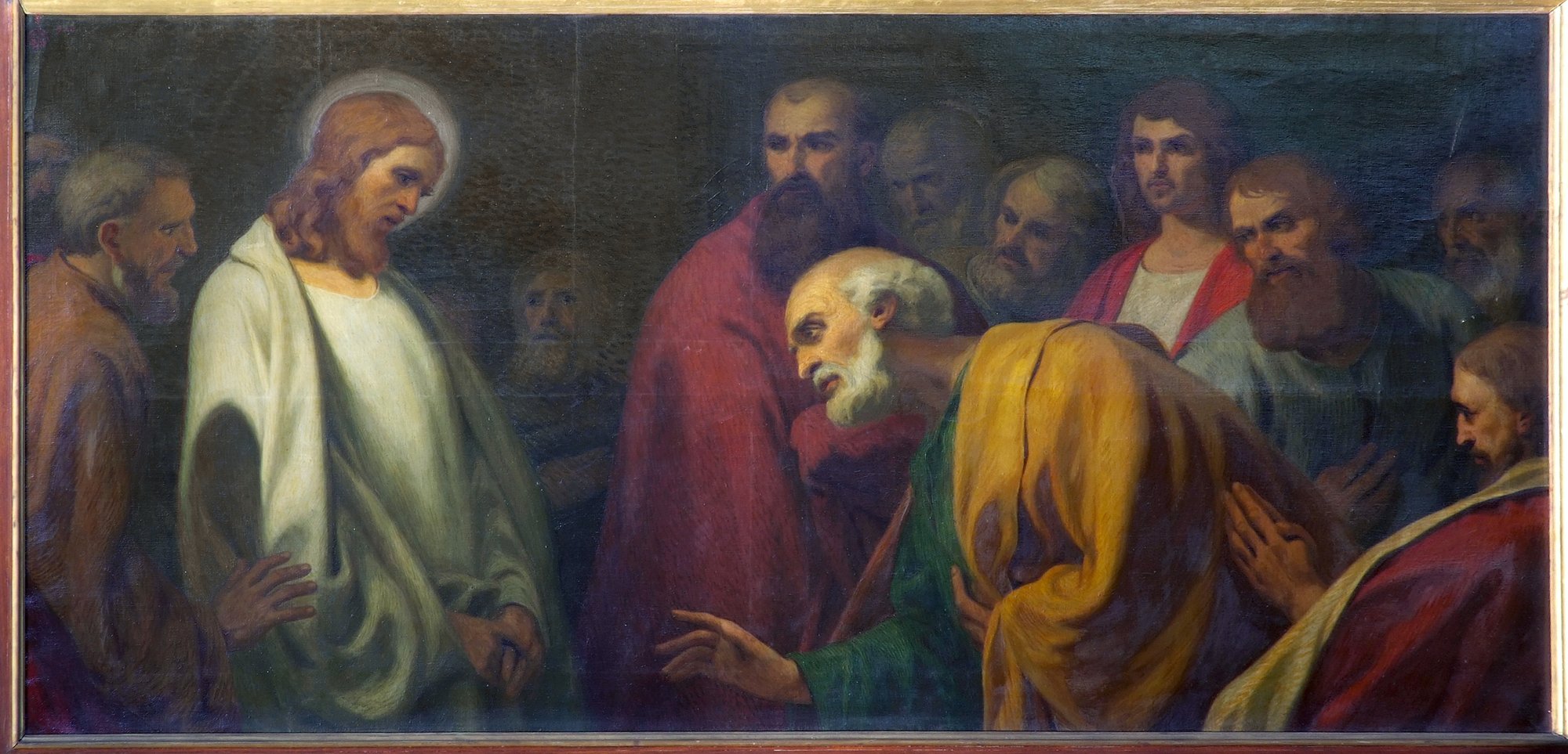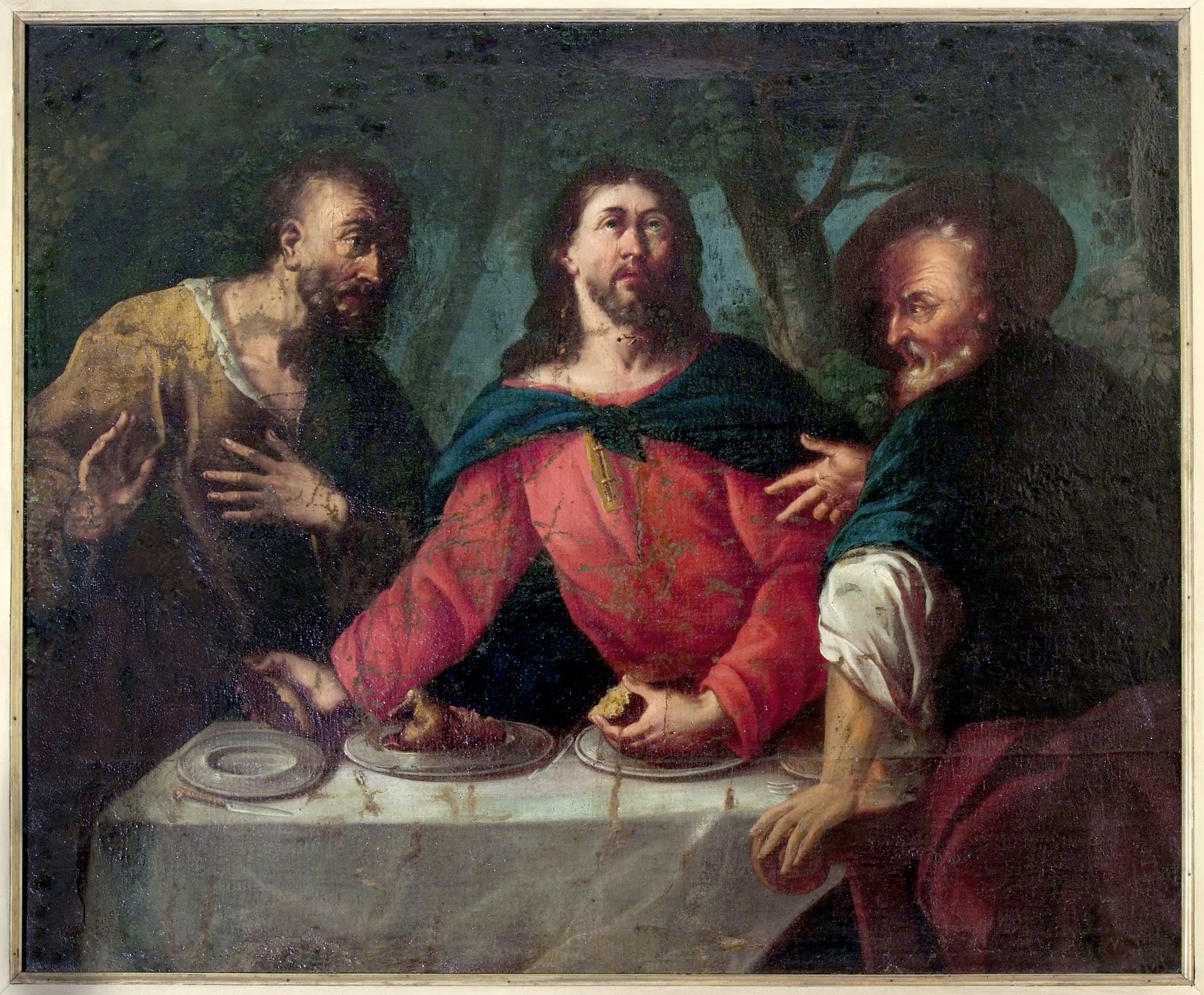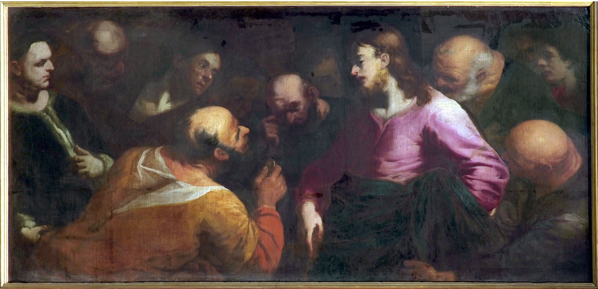 Il bel dipinto con il Cristo della moneta del friulano Antonio Carneo (1637-1692) è un’opera che per l’impostazione, per il cromatismo “ombrato”, ma soprattutto per il luminismo che esalta le teste arditamente scorciate dei personaggi, può essere collocata cronologicamente al rientro del pittore dal suo soggiorno veneziano e dunque verso il 1670, in un periodo ancora “eclettico”, fatto di ricerca continua. Lo dimostra, ad esempio, il profilo dell’apostolo a sinistra, che sembra tratto da Tiziano, mentre certe “opulenze tecniche” rimandano a Bernardo Strozzi.