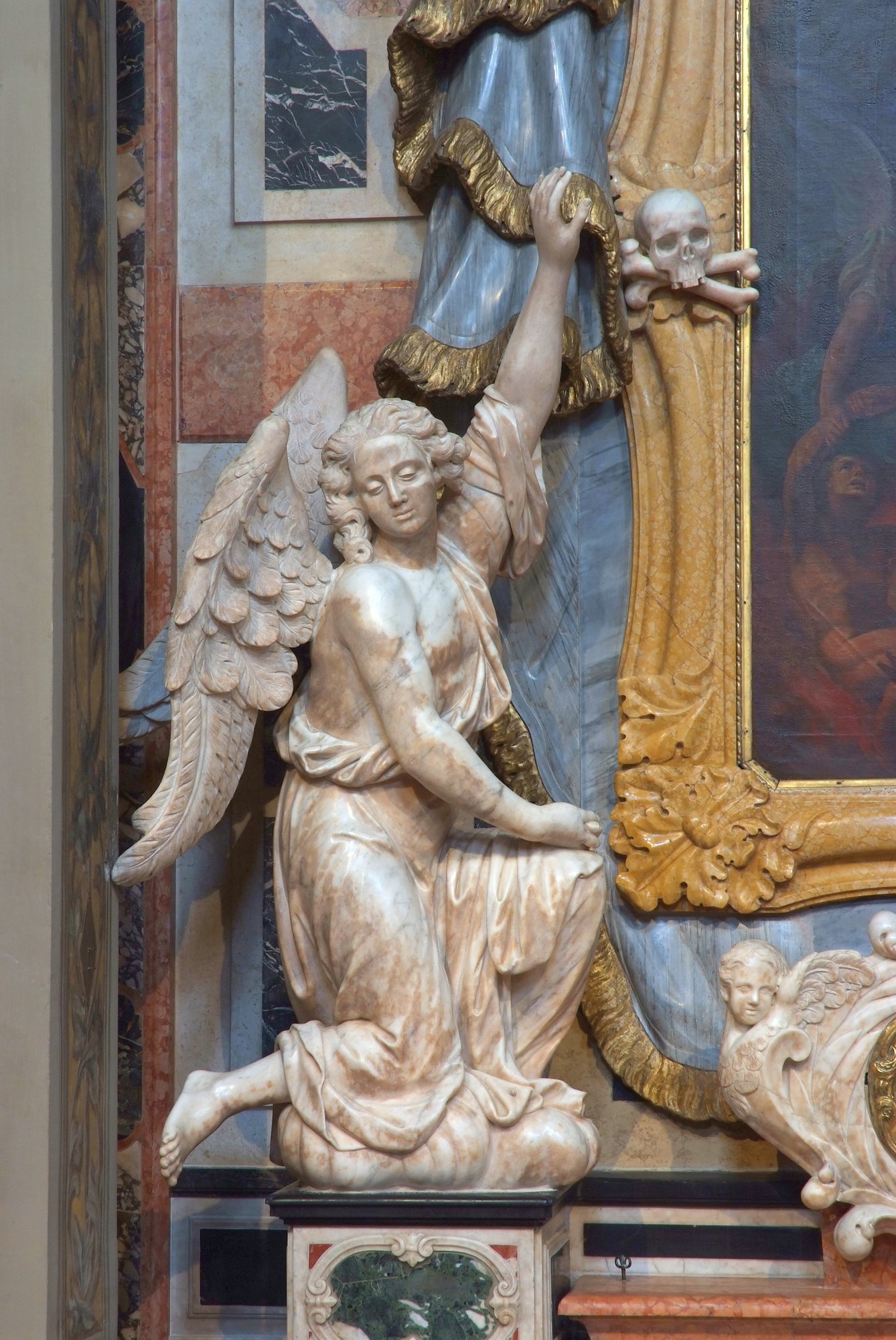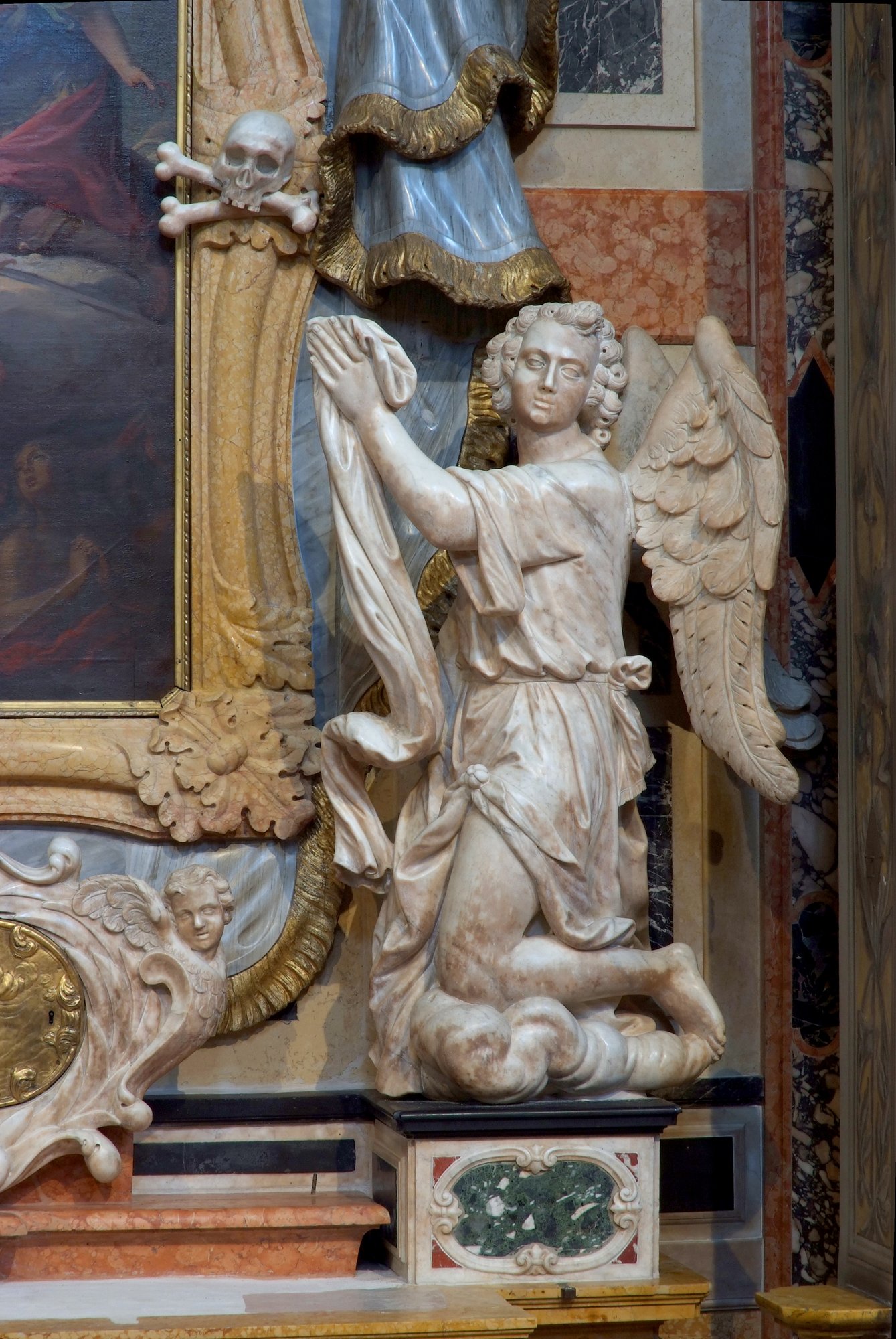 Sulla fronte del manufatto il paliotto, leggermente bombato, si articola ai lati con lastre marmoree, sottolineate da cornici in marmo bianco con decorazioni a festoni e ricci. Paraste e colonne sostengono l’alto fastigio quadrangolare mosso ancora da cornici mistilinee su cui spiccano, al centro, due angioletti.