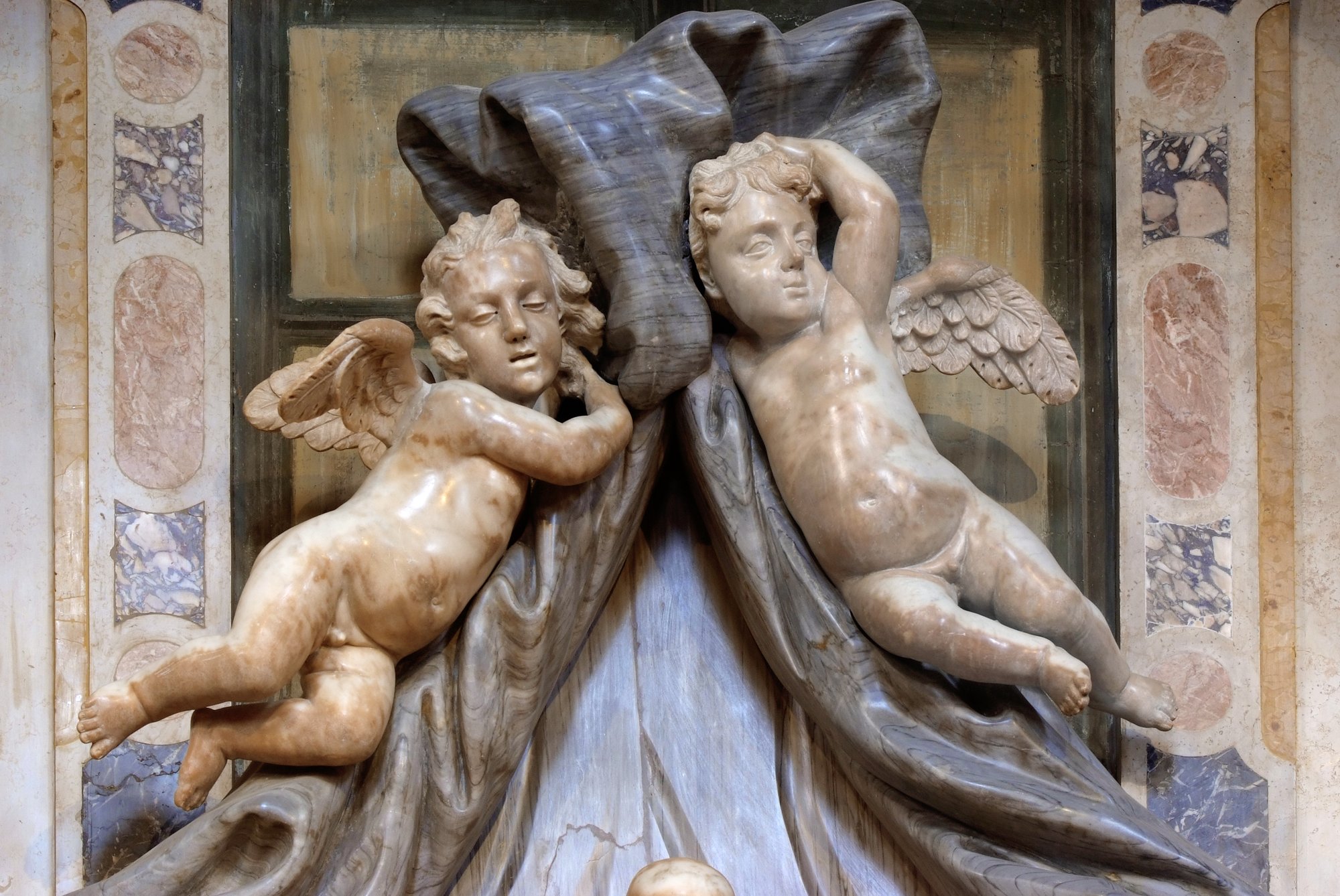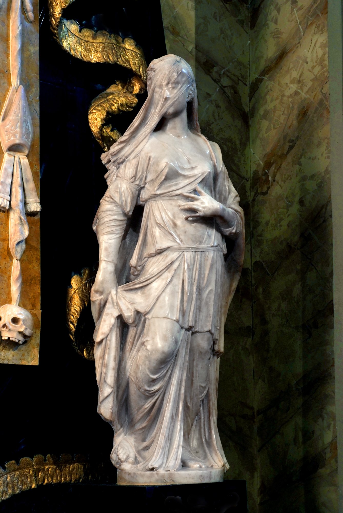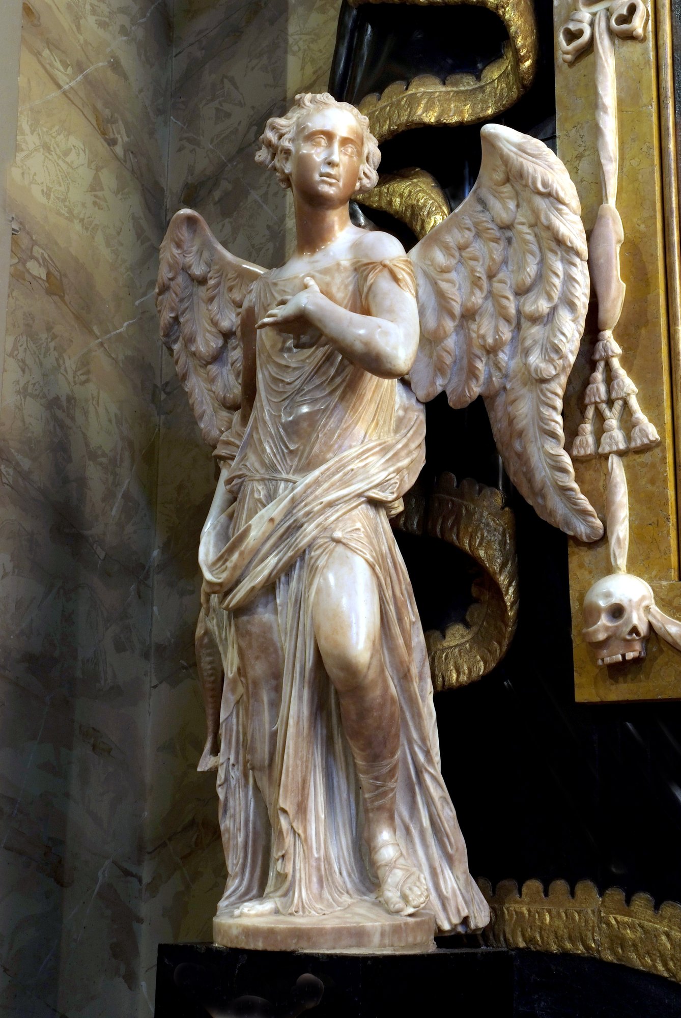 Il complesso architettonico si qualifica in modo particolare per le due belle statue laterali che rappresentano l’arcangelo Raffaele, il guaritore di Tobia “che seppelliva i morti”, quindi nuovamente legato alla funzione dell’altare, e Sara, moglie di Tobia, la quale per alcuni studiosi potrebbe rappresentare simbolicamente il Lutto. Sono entrambe opere attribuite con certezza ad Antonio Corradini. La datazione di queste due statue è dubbia, in quanto una parte della critica antica le ritiene “venute da Roma” intorno al 1740, mentre più verosimilmente si possono collocare intorno al 1720, quando il Corradini eseguì la figura velata della Religione per la cattedrale di Udine.