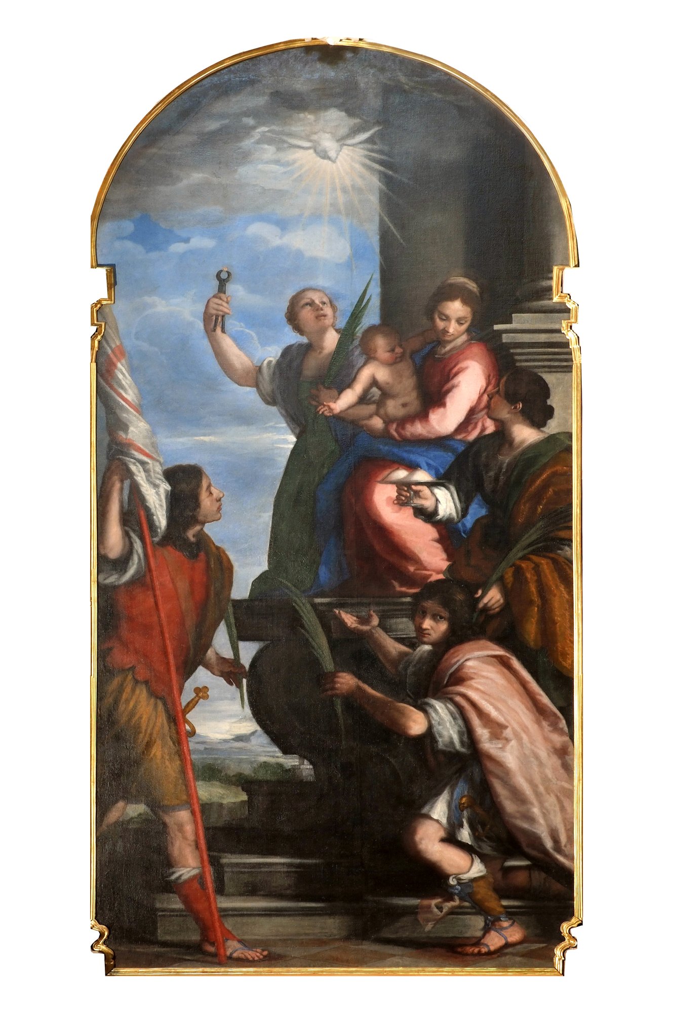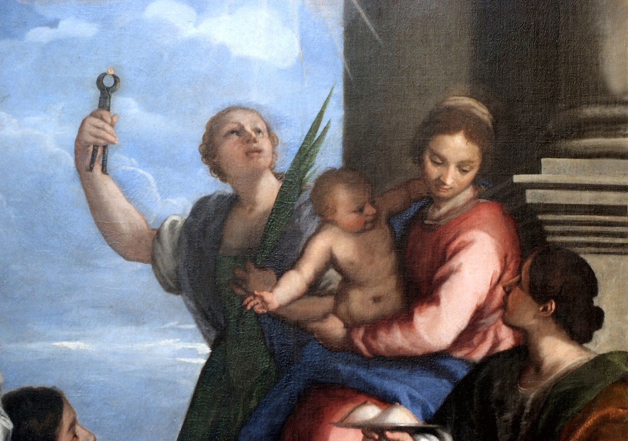 i piedi della Madonna si impone la bella figura di sant’Apollonia, titolare dell’altare, che regge in mano secondo l’iconografia tradizionale le tenaglie, simbolo del suo martirio. A sinistra è raffigurata sant’Agata che tiene il piatto con i seni che le erano stati tagliati prima della morte.