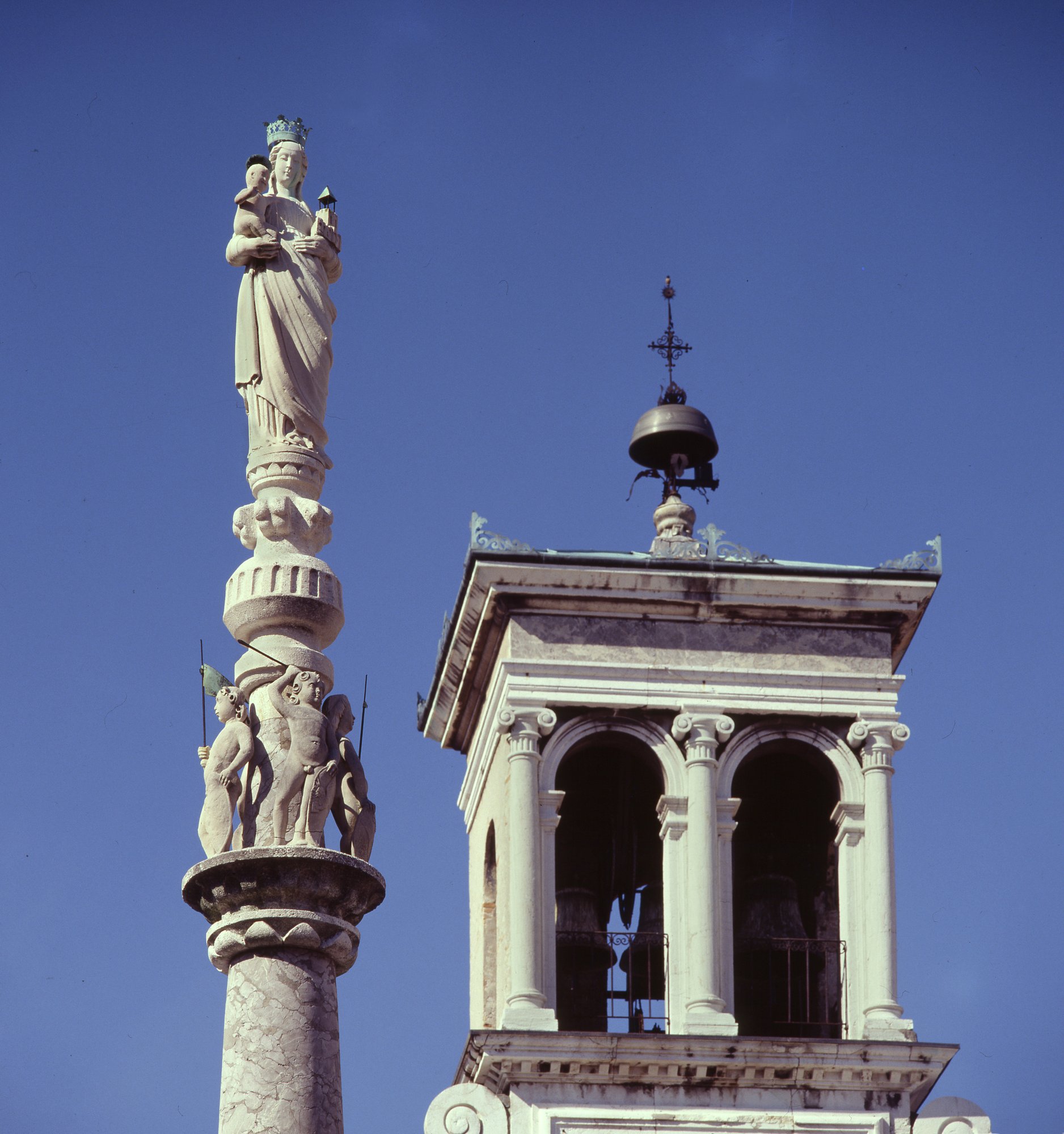 L’opera fu eseguita probabilmente da maestranze lombarde, in quei tempi presenti in città a causa della saturazione del mercato veneziano. Ad uno di questi artisti è da attribuire anche la Colonna sormontata dalla coeva Vergine col Bambino, collocata sull’area sopraelevata. Curiosi e di qualche interesse sono i ferri che sporgono da essa: un tempo, secondo le antiche cronache, reggevano una campana i cui rintocchi si diffondevano alle ore nove per indicare la fine del “mercato libero”: dopo quell’ora, infatti, la compravendita era permessa “solo tramite i venditori di piazza”.