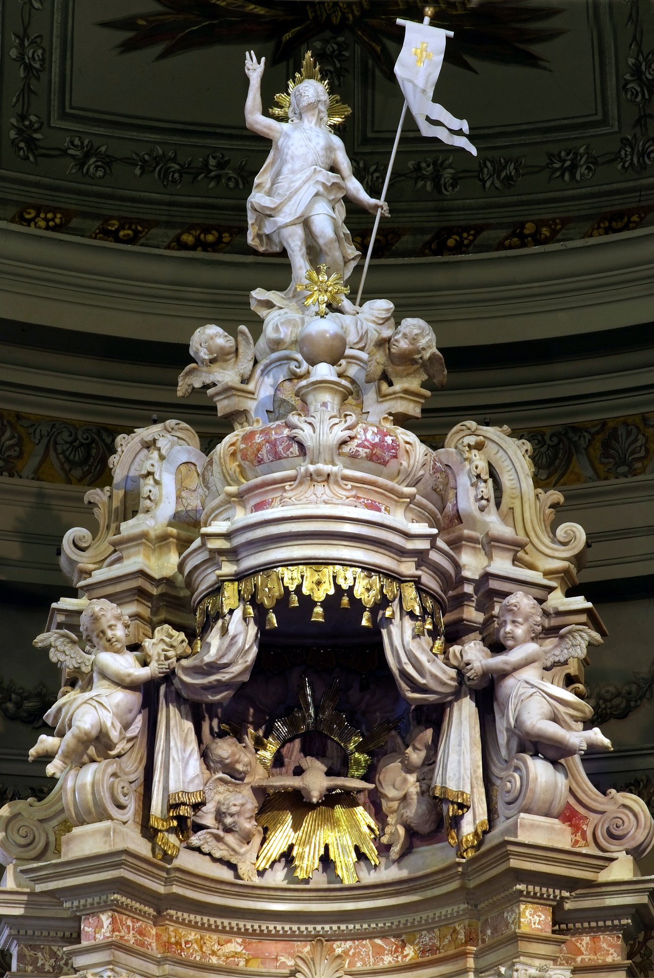 Al di sopra della mensa poggia il tabernacolo sotto un elaborato tempietto a colonne, che si conclude con un “aereo baldacchino” con la statua del Redentore.