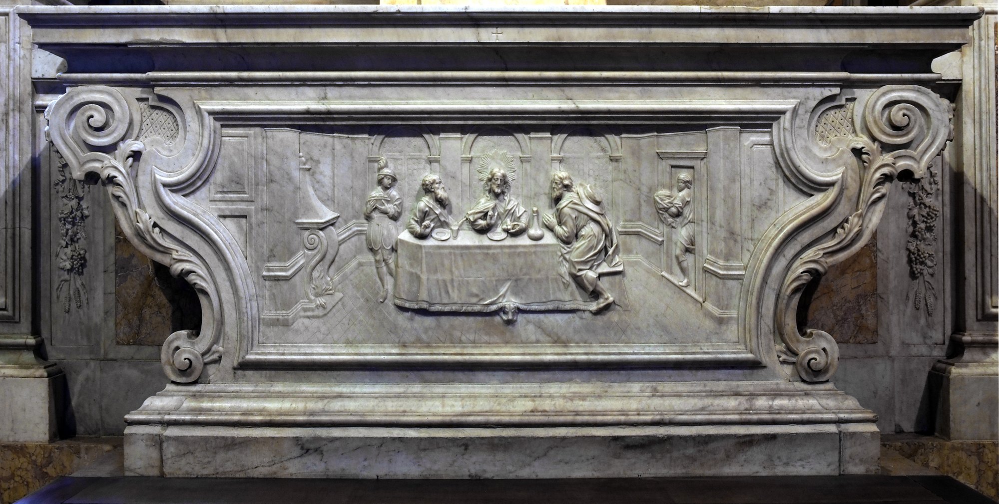 L’altare nel suo aspetto monumentale presenta la mensa con un paliotto in cui vi è il racconto della Cena in Emmaus: intorno al tavolo, compreso entro una quinta di colonne, Cristo spezza il pane e si rivela, per la prima volta dopo la Resurrezione, ai due apostoli Cleopa e Luca.