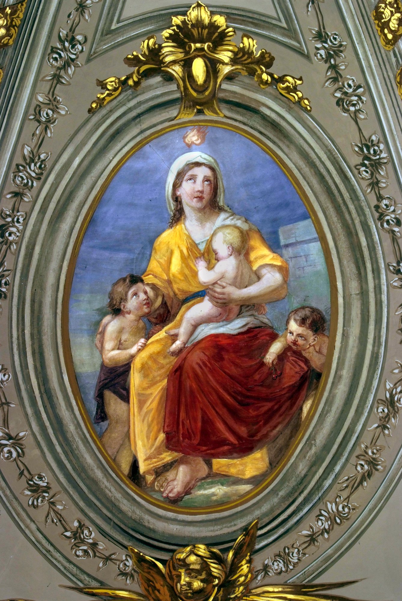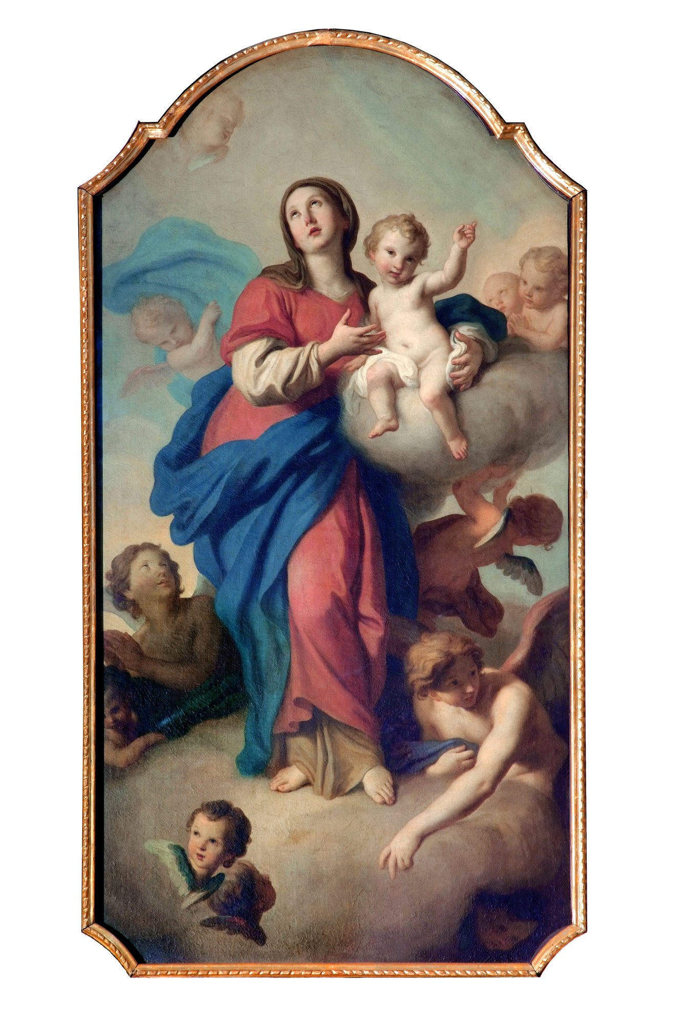 Questo dipinto può essere datato intorno al 1750, ossia prima della definitiva partenza dell’autore per l’Europa orientale. Come negli altri numerosi ritratti del Rotari il volto di questa Madonna è studiato per creare un effetto di grande dolcezza: lo sguardo rivolto al cielo, il rossore appena velato delle guance, l’elegante mano portata al Figlio, memore degli schemi accademici del Balestra, mentre l’Angelo di destra sembra richiamare Solimena, mentre i colori preannunciano il neoclassicismo di Anton Raphael Mengs.