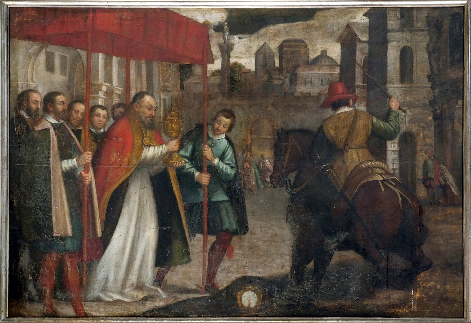 Il riferimento è a quanto accaduto il 6 giugno 1453, quando, durante una guerra, le truppe piemontesi ad Exilles saccheggiarono il villaggio rubando in chiesa anche la suppellettile sacra, compreso l’ostensorio col Santissimo. Il quadro raffigura il momento in cui un cavallo inciampando lascia cadere i sacchi con il bottino, mentre l’ostia si eleva luminosa verso il cielo. A sinistra il vescovo Ludovico di Romagnano raccoglie l’ostia nel calice e in processione solenne la riporta in chiesa. L’ignoto artista racconta l’accaduto con dovizia di particolari soffermandosi anche nella descrizione del paesaggio urbano.