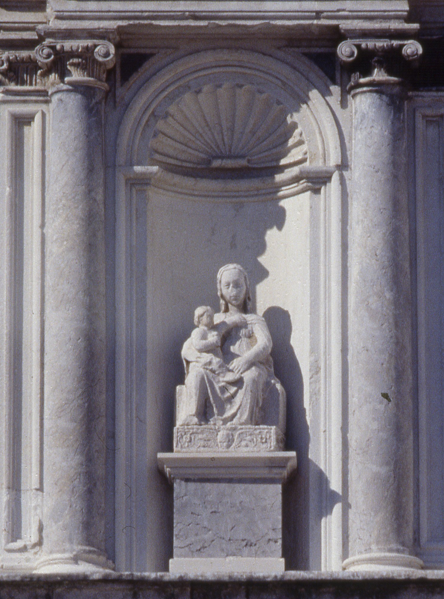 Sul balcone è collocato un piccolo altare e all’interno della nicchia è posta la statua della Vergine col Bambino un tempo posta all’interno della chiesa. È opera ormai concordemente attribuita a Giorgio da Carona lapicida dei laghi lombardi, giunto in Friuli da Venezia, il quale nel 1475, oltre a questa scultura, eseguì per la chiesa di San Giacomo anche figure di Apostoli in pietra, andate perdute. La statua che si può oggi ammirare sulla facciata dimostra una certa capacità compositiva non priva di imperfezioni, ma caricata di dolcezza nei volti e di grazia nelle forme.