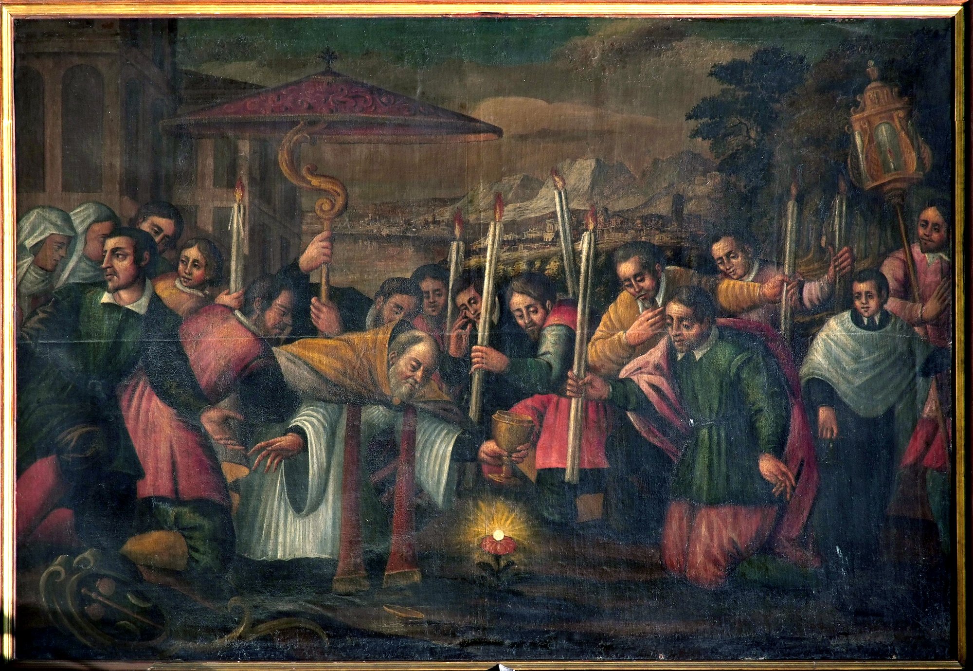 In questo dipinto è colto il momento in cui il curato del paese rimette l’ostia nel calice e in processione la riporta in chiesa.