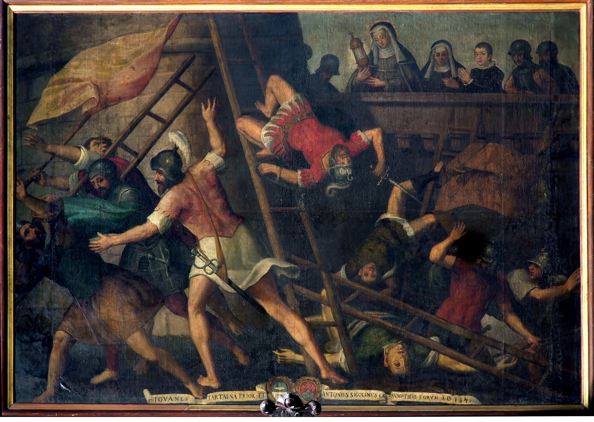 L’avvenimento, ampiamente documentato nell’arte, risale al 1240 quando Federico II con l’esercito composto principalmente da mercenari saraceni assediò Assisi. Santa Chiara, seppur ammalata, alzando l’ostensorio fece fuggire l’esercito nemico salvando così, con l’aiuto delle consorelle, convento e città. L’ignoto pittore dipinge qui una scena concitata: in primo piano soldati e scale si aggrovigliano, mentre alcuni saraceni scappano colpiti dalla forza divina e altri cadono al suolo.