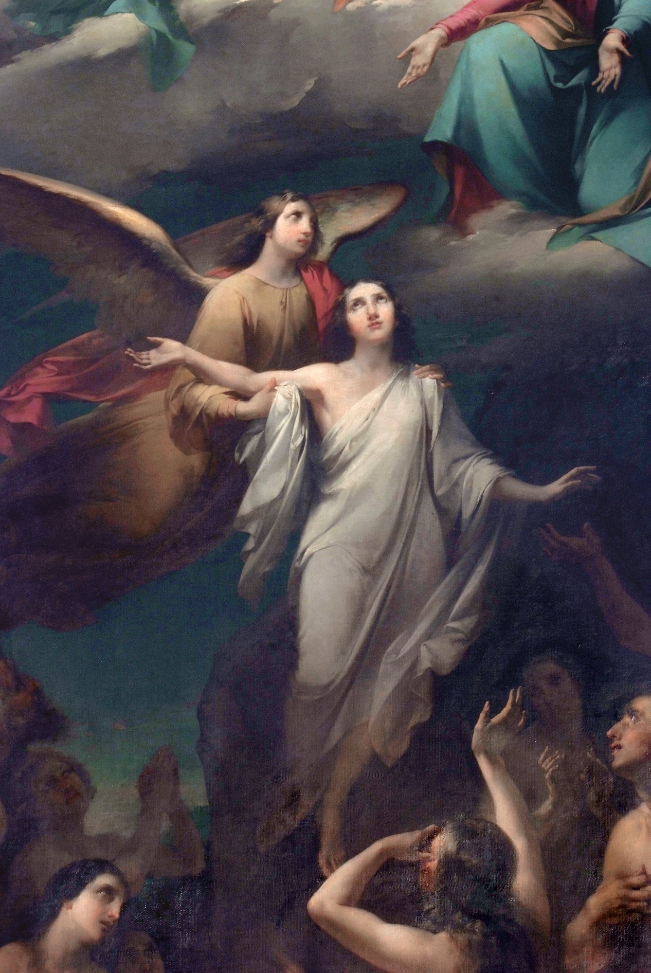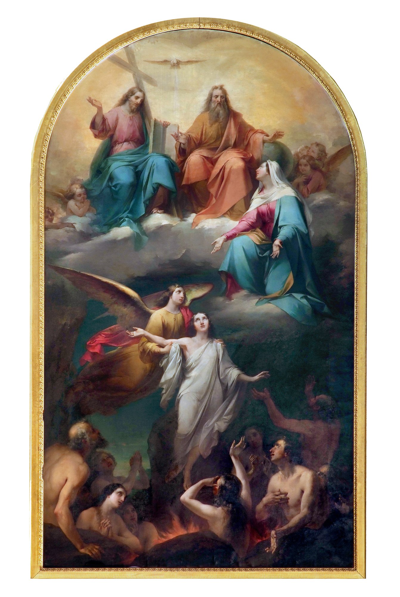 Le due parti del quadro sono collegate dall’Angelo in volo che solleva verso il cielo un’anima redenta. I colori sono un po’ “porcellanosi”, tipici della pittura religiosa del Grigoletti, che fu abile soprattutto nei ritratti, mentre qui appare motivato da intenti puramente illustrativi risultando eccessivamente condizionato dal gusto corrente.