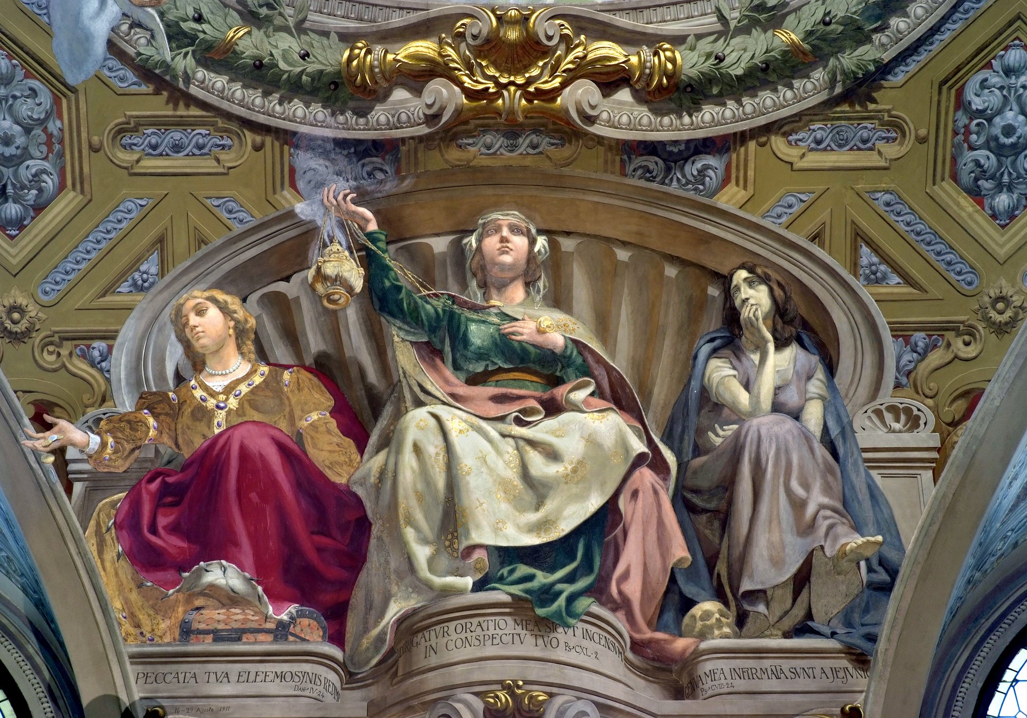 Il pittore di Recanati Biagio Biaggetti (1877-1948) giovanissimo divenne allievo di Ludovico Seitz, di cui assimilò pienamente la lezione con tutto l’eccesso decorativo e una religiosità manierata che diventa talvolta retorica, come in queste due figure. Visse per lo più a Roma dove nel 1921 Benedetto XV lo nominò direttore artistico per le pitture dei Palazzi Apostolici, carica che mantenne fino al 1945. Conoscitore del “buon fresco” e delle varie tecniche pittoriche istituì nei Musei Vaticani un moderno laboratorio di chimica per le analisi dei materiali impiegati in antico nell’opera d’arte, avvertendo così il problema scientifico che sta alla base di ogni intervento conservativo. Il Biaggetti fu considerato l’esponente ufficiale della contemporanea arte cristiana, solenne e didascalica, ricevendo prestigiose commissioni in particolare come freschista.
