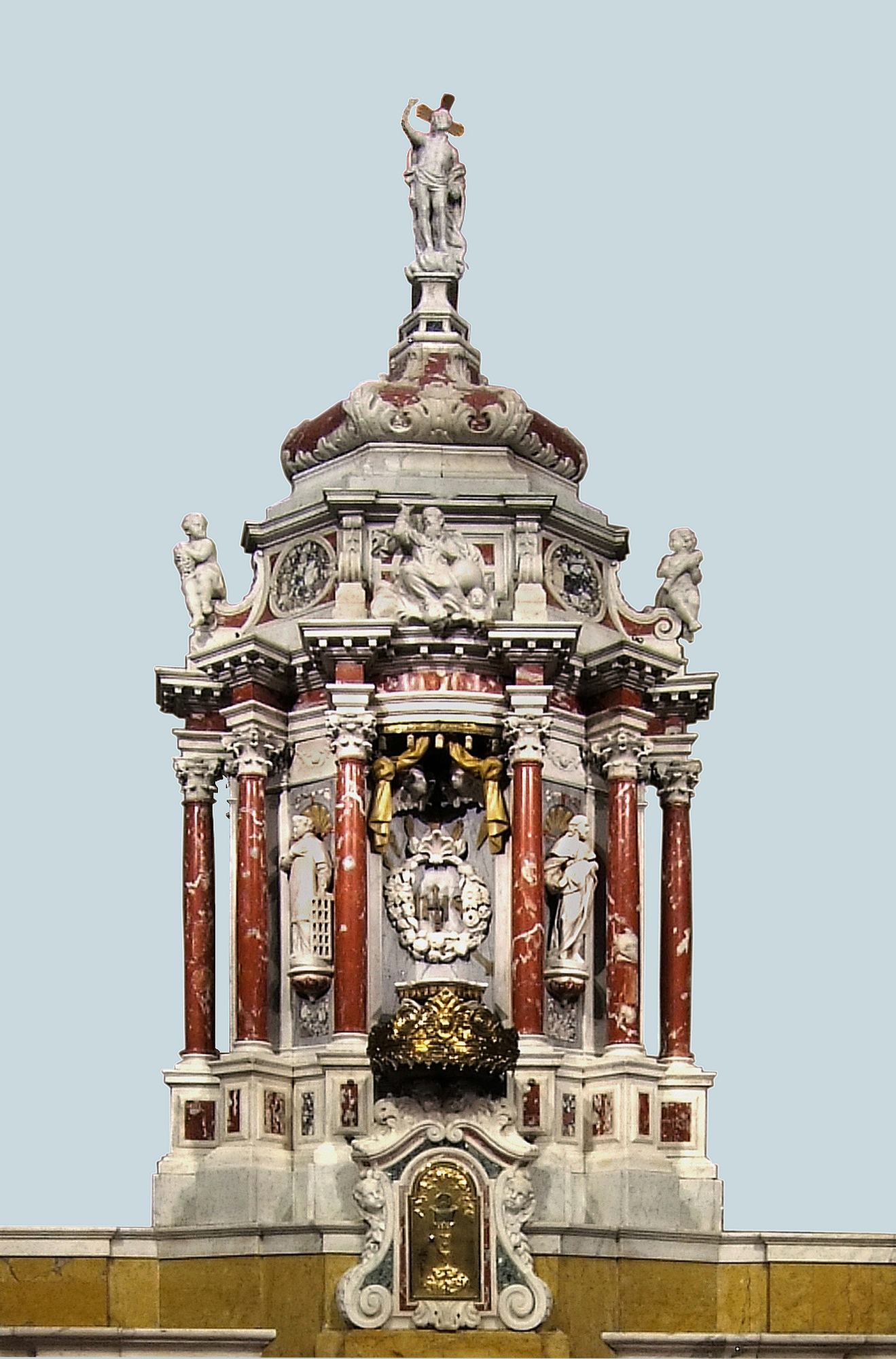 L’alzata è costituita dal tabernacolo in marmi policromi, a forma di tempietto decagono e ottagono nel tamburo, con sei colonnine corinzie addossate agli spigoli. Lo spazio tra le colonne è occupato da due nicchie con le statuine di San Lorenzo e San Giacomo. Al centro, sotto un tendaggio, il monogramma cristologico contornato da una ghirlanda. Sulla trabeazione aggettante a cornici spezzate poggiano Dio Padre con globo e angioletti, mentre altri due angioletti, seduti ai lati delle volute, reggono spighe e grappoli d’uva. Conclude la composizione un cupolino a cipolla molto schiacciata, suddiviso in spicchi da foglie di acanto ascendenti, con la figura del Risorto sulla sommità. A completamento, la portella del tabernacolo e la bandierina del Redentore realizzate dall’orefice Antonio Nascenti di Udine nel 1735.