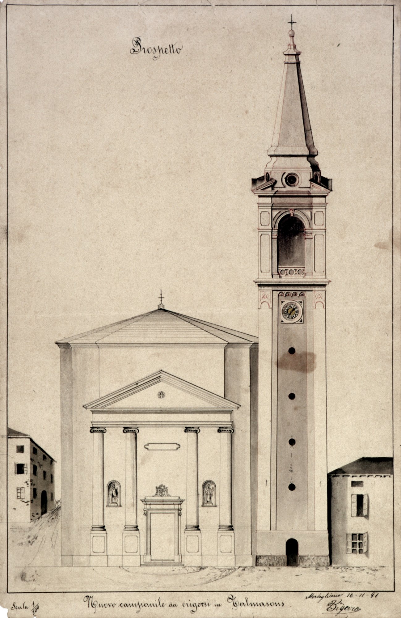 Al parroco don Vincenzo Tonutti si deve anche l’inizio della costruzione del campanile nel 1893, dopo la demolizione dell’antico manufatto a causa delle gravi lesioni di un fulmine alla cella e al cornicione.