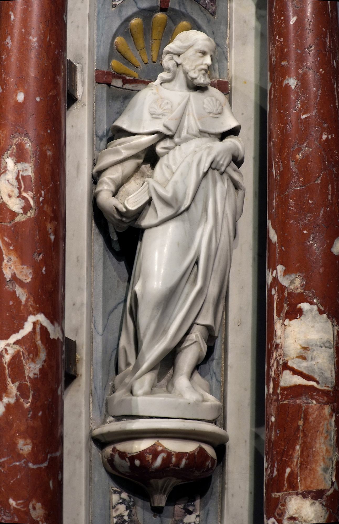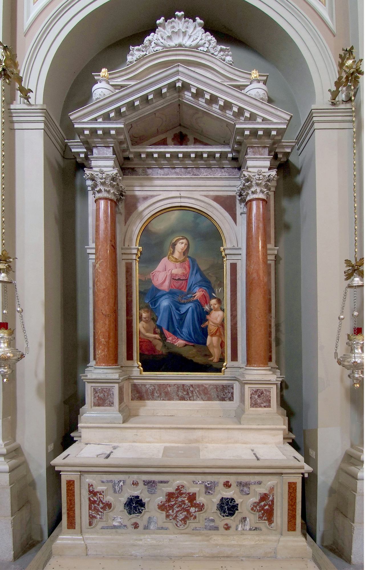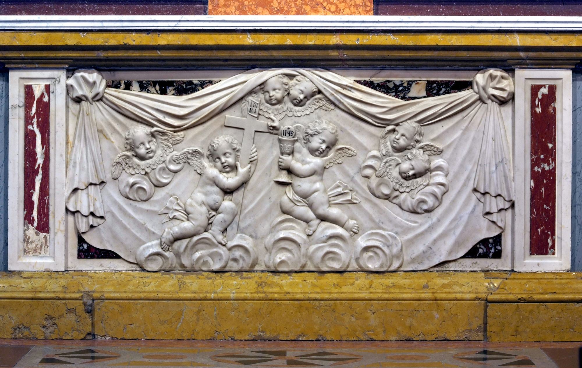 L’altare è articolato su due piani e si eleva su cinque gradini in marmo rosso: presenta una mensa a parallelepipedo, ornata ai lati da tarsie e volute arricciate, reca sul frontale un drappo racchiudente due putti che reggono calice e croce, simboli di “passione”, e testine angeliche di corollario.