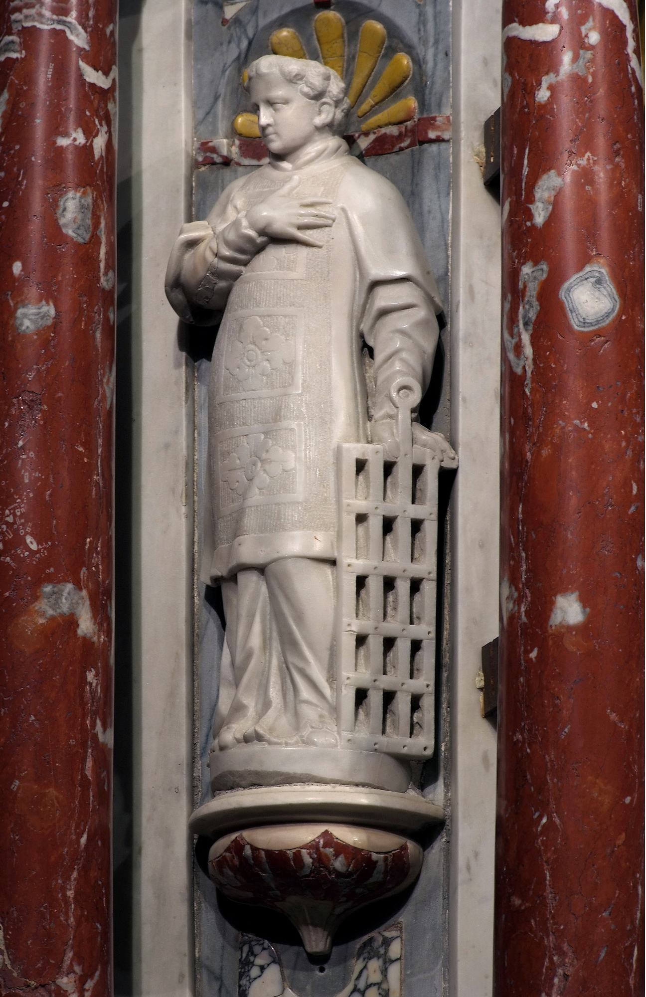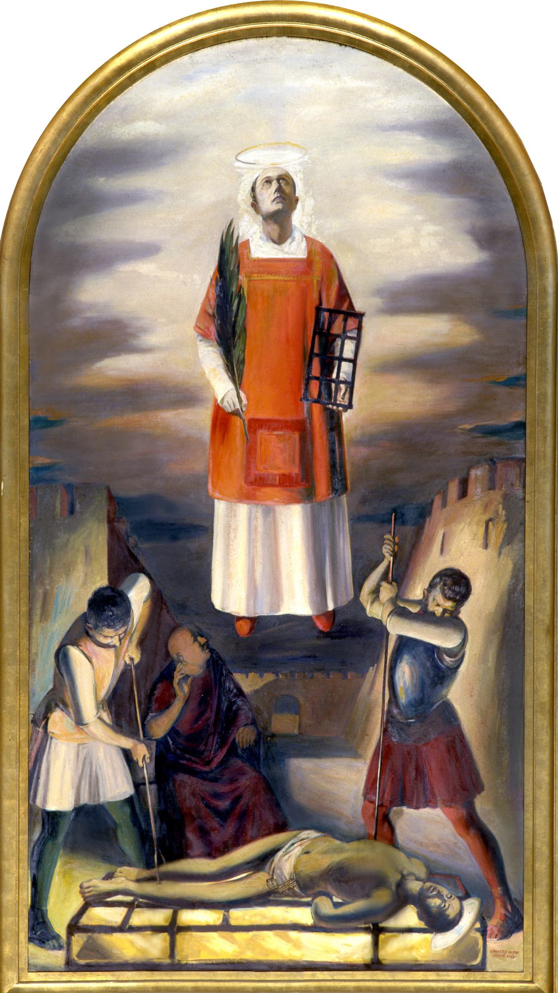 La tela di Pittaco fu sostituita con quella realizzata nel 1952 dal pittore udinese Ernesto Mitri (1907-1978), ora in deposito presso la Canonica. La vivace composizione, articolata su piani diversi e definita dalle linee oblique delle architetture e dalla posa degli aguzzini, focalizza l’attenzione sul momento del martirio, mentre la parte la parte centrale riceve slancio dalla figura del santo in dalmatica rossa, palma e graticola, elevato al cielo tra lo stupore del personaggio astante.